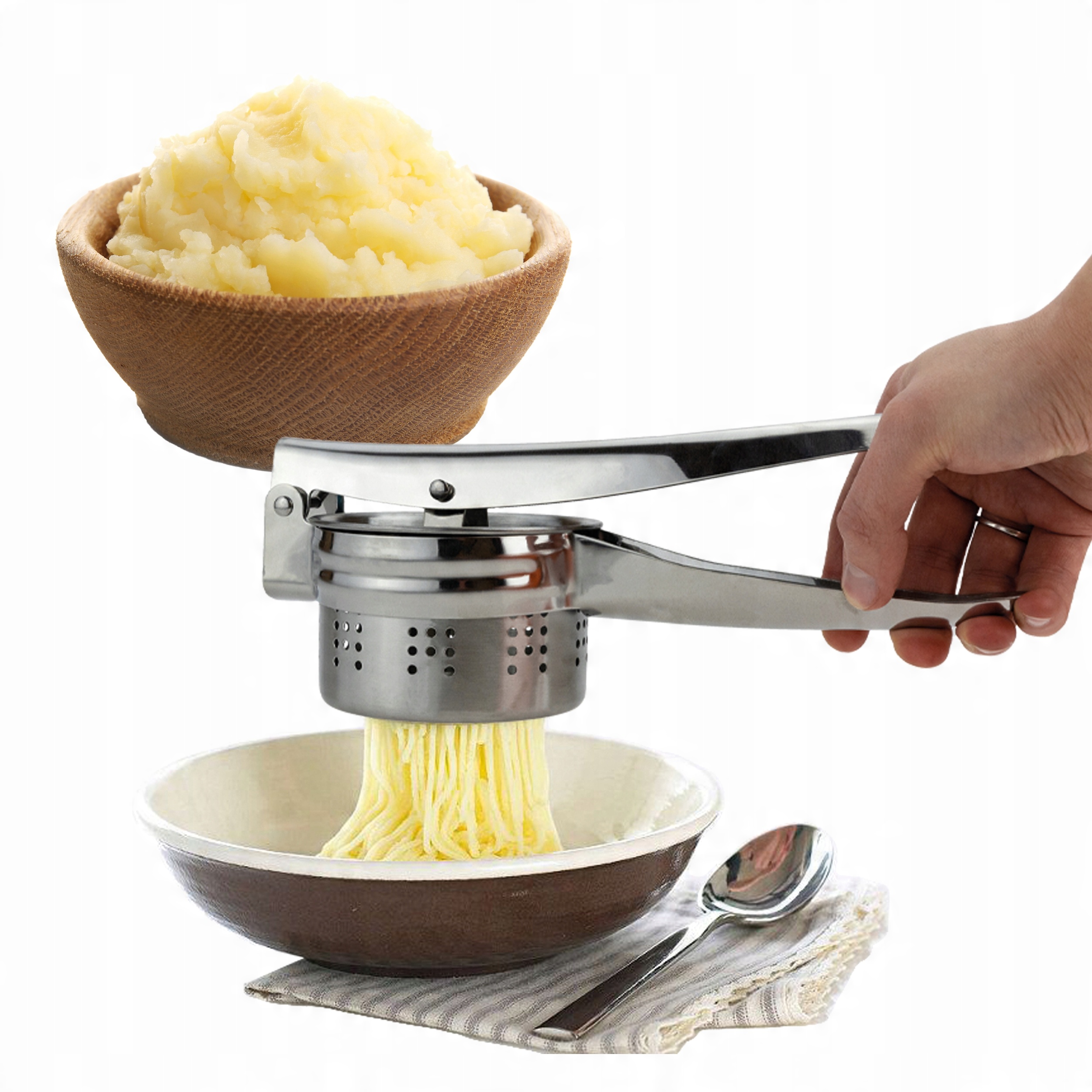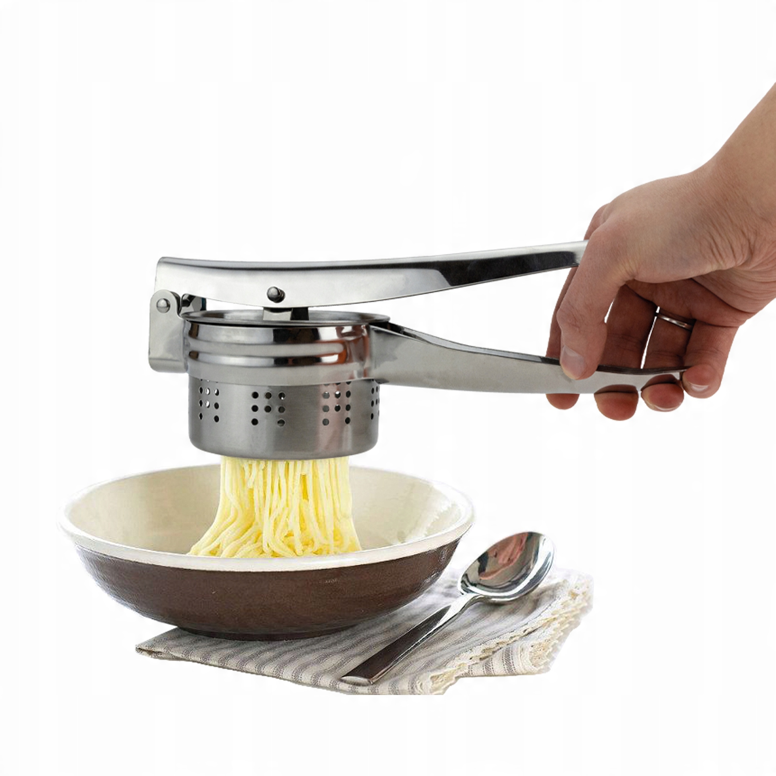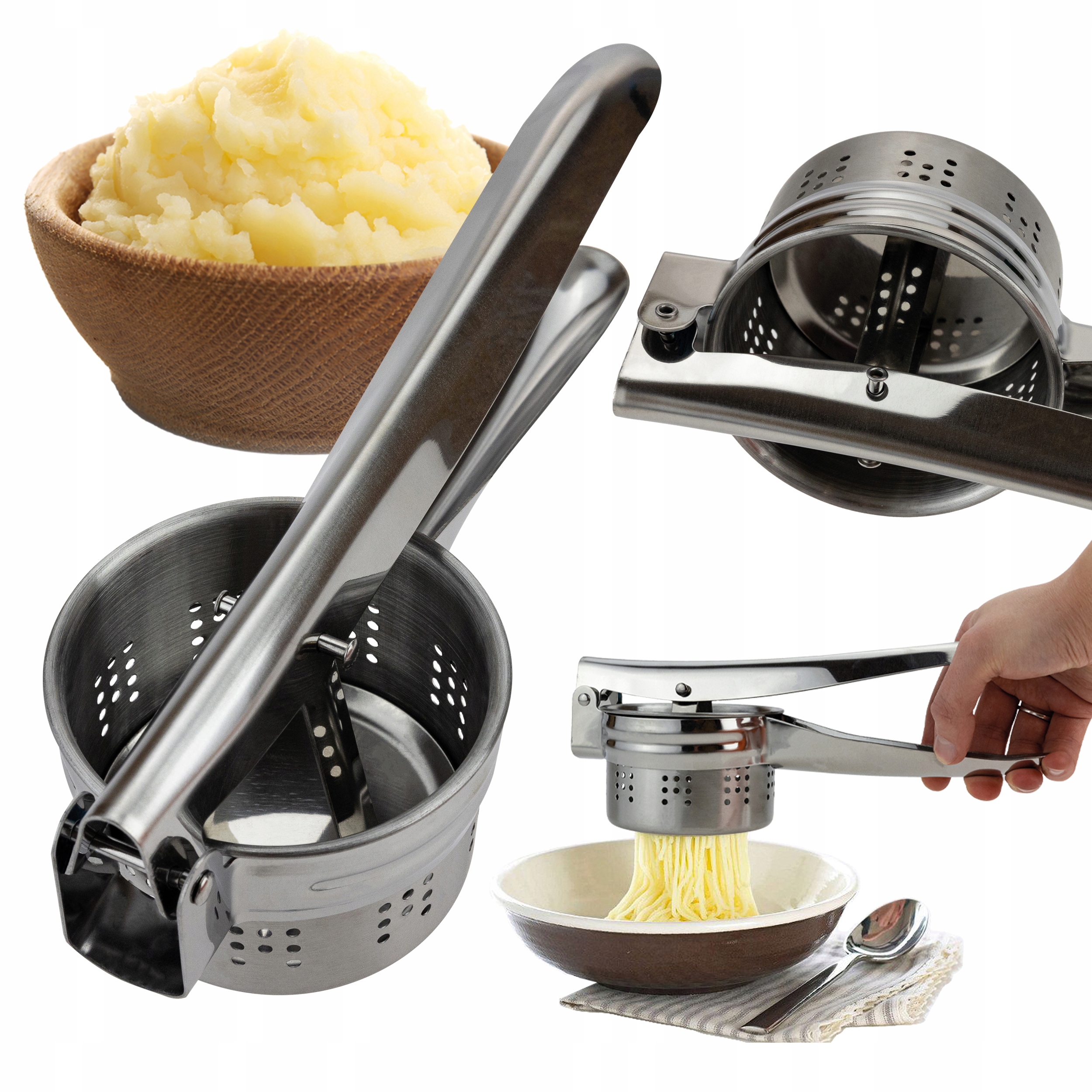 Кухонний інструмент, який дозволяє легко і швидко готувати картоплю різними способами. Завдяки йому ви можете швидко та легко віджати картоплю без грудочок, що важливо при приготуванні пюре, картопляних галушок або силезьких галушок.
