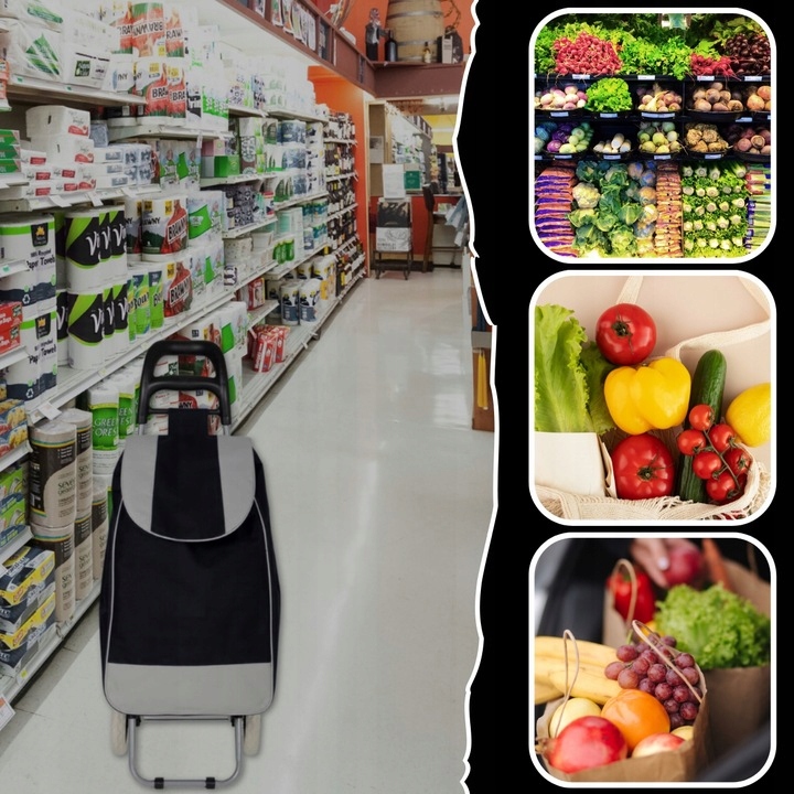 Кошик для покупок оснащено міцною сталевою рамою, яка гарантує довговічність і стабільність продукту. Великі колеса з гумовим покриттям забезпечують амортизацію та легкість подолання нерівностей.