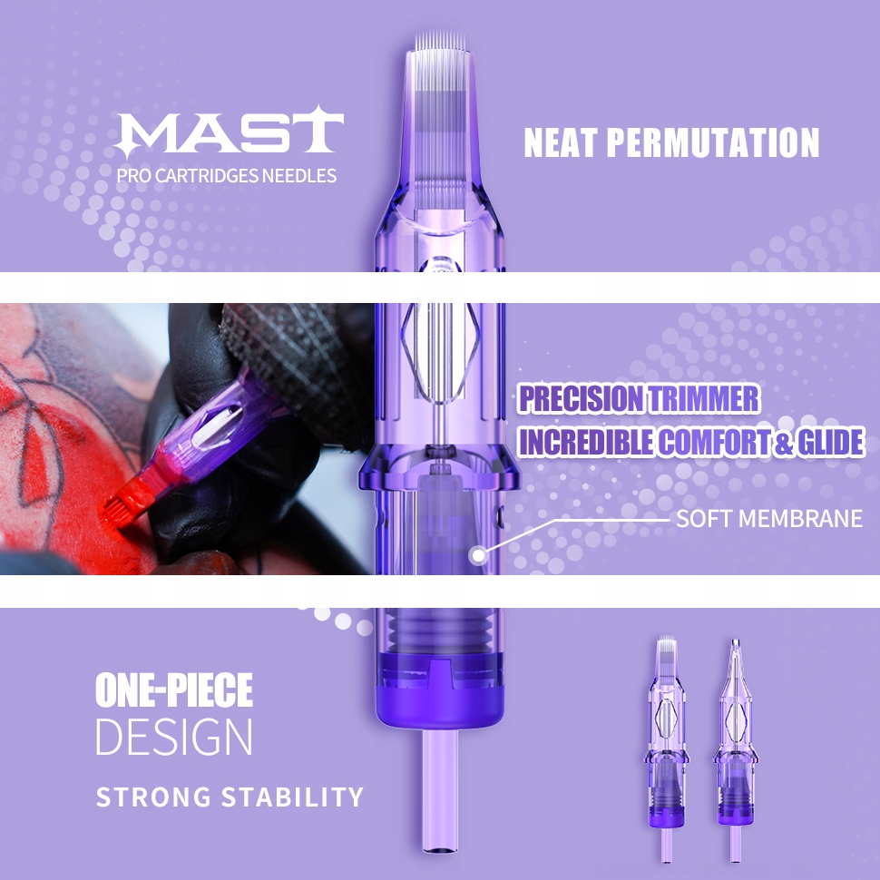 Це найякісніші картриджі MAST PRO, мабуть, найпопулярніші голки в світі з унікальною стабілізацією та гнучкою мембраною для професійних тату-майстрів і майстрів перманентного макіяжу. Вставки протестовані та схвалені багатьма майстрами перманентного макіяжу. Унікальна технологія стабілізації всередині картриджа, яка повністю усуває люфт голки.