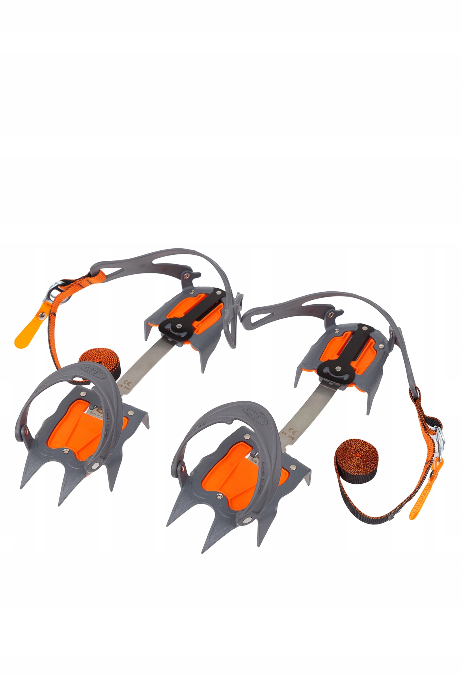 ✔️ Скоби Climbing Technology виготовлені зі стійкої загартованої сталі та міцного пластику, який стійкий до низьких температур і зберігає в них свої властивості. Крампи регулюються під розміри взуття 34-47, а сама настройка не потребує використання будь-яких інструментів. Модель цих туристичних кошок оснащена 10 зубцями, що забезпечують хороший контакт із землею. Кошки мають снігостійкі накладки, які захищають низ від налипання снігу.