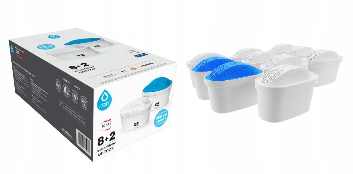 Фільтр Dafi Unimax містить ретельно підібрану та систематично контрольовану суміш фільтрів, що складається з активованого вугілля та іонообмінної смоли. Завдяки цьому фільтр значно знижує жорсткість води (що викликає утворення накипу), вміст важких металів, сполук хлору та інших небажаних речовин, які можуть вплинути на смак водопровідної води. Підходить для більшості глечиків інших виробників.