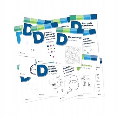 Набір із 417 чорно-білих робочих аркушів формату А4, які можна заповнювати або копіювати кілька разів. Він призначений для підтримки та лікування учнів віком 10-16 років зі специфічними проблемами у сфері: дислексія (труднощі з читанням), дизортографія, дисграфія, дискалькулія. У набір входять такі теми, як пам'ять і зорове сприйняття (кольорові картки), зорове сприйняття, числа, дроби, відсотки, оперативне мислення, симетрія, відображення, пропорції, пам'ять просторових відносин, концентрація, схеми, годинник, монети, геометрія, графомоторика. , навички лінгвістики, орфографії, каліграфії.