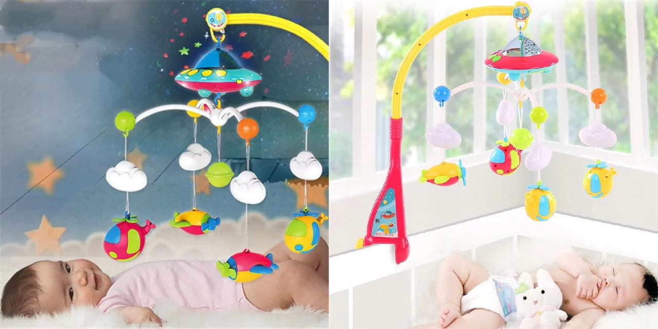 Музична скринька у формі НЛО, іграшки на руку у формі літаків та вертольотів. За допомогою пульта дистанційного керування ви можете зручно керувати каруселлю, приводячи її в рух або вмикаючи проектор.