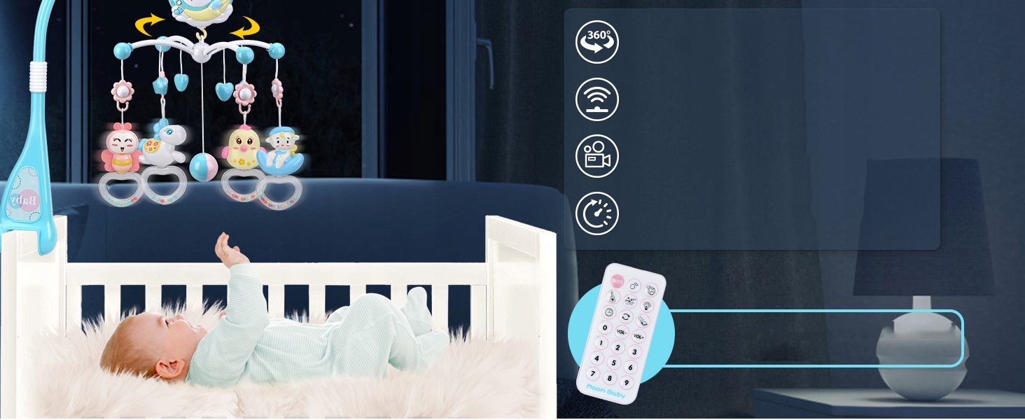 Карусель має шість кнопок, за допомогою яких можна перемикатися між функціями. Це дозволяє дітям виявити причинно-наслідковий зв'язок, пов'язаний з натисканням кнопок. Легко збирається. Підходить для ліжечка, коляски, люльки, автокрісла, люльки тощо.