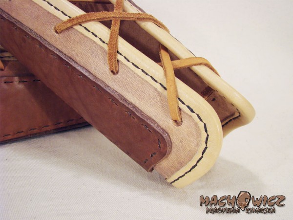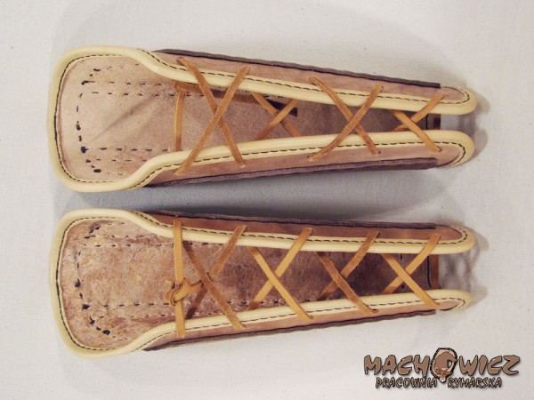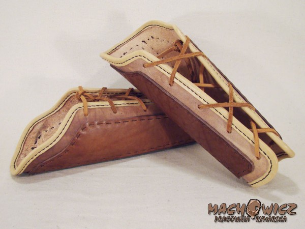 Наручі нові, з товстої чистої шкіри. Посилені нашивками з тієї ж шкіри, зшиті вручну. Вони ідеально підходять для боротьби. Все це оздоблено шкіряною обробкою, зшитою вручну з товстого вощеного лляного шпагату.