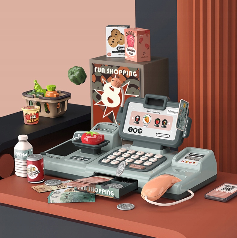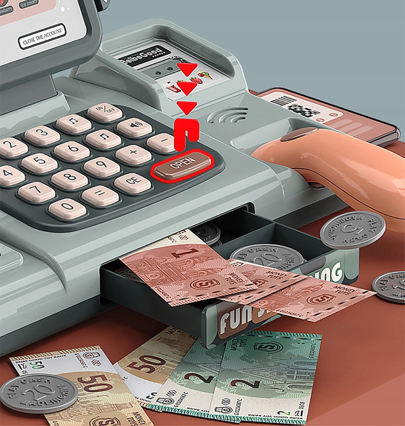Каса має висувну грошовий ящик . Просто натисніть кнопку «відкрити», і ящик висунеться. Це чудовий елемент, який допоможе дітям зрозуміти, як касири в справжніх магазинах зберігають гроші.