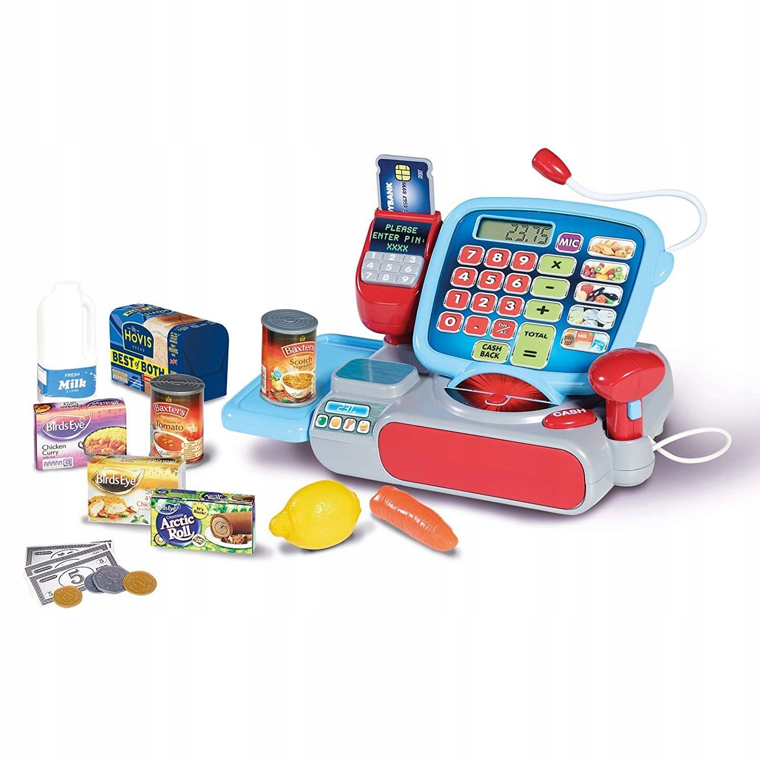 Іграшкова каса має всі найважливіші елементи та функції справжнього пристрою такого типу: сканер і зчитувач кодів, ваги, зчитувач картокі касаяка відкривається кнопкою. Всередині є відділення для монет і банкнот. У набір також входять 3 картонні упаковки, пачка молока, 2 бідони, імітація лимона, моркви та хліба, банкноти, монети та банківська картка для ще більшої цікавості.