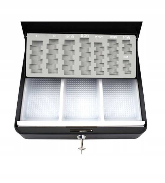Всередині касети існує пластиковий лоток для євро -котушки (також підходить PLN) з розмірами 27,5x11см, а також для банкнот з розміром 29x21cm з трьома композиціями з Dimensions 9x20CM. У нижній частині касети є 3 відсіки для банкнот.