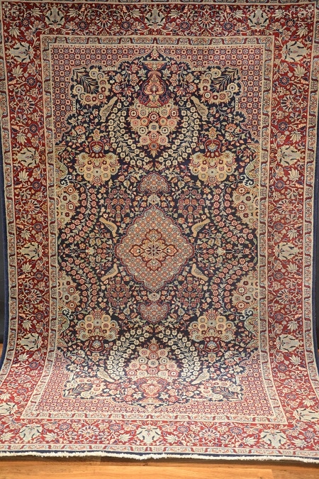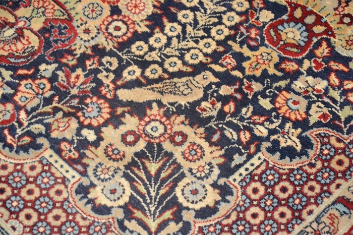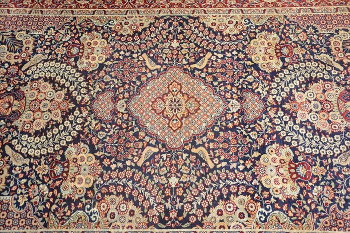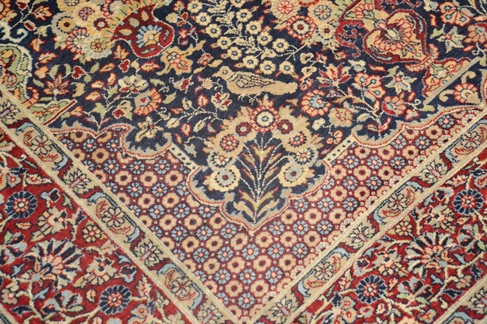 Висококласний і надзвичайно красивий, оригінальний перський килим KASHAN - приблизно 40 років, ручної роботи та виготовлений з овечої вовни найвищої якості, підтвердженого сертифікатом якості та походження, з щільним кроєм, блискучим флісом. Східний дизайн (рясно прикрашений квітковими композиціями та фігурками птахів) і гармонійно контрастні кольори чудово виглядають як на підлозі, так і на стіні.