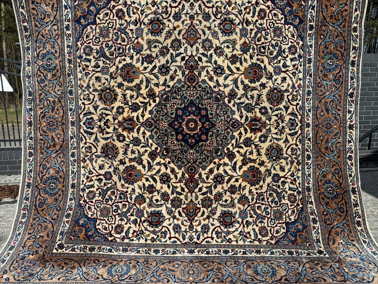 ТЕМА: Килим ручної роботи. Оригінальна східна перська вироблена в Ірані з провінції Кешан. Є бирка під килим + паперовий сертифікат під замовлення. У галереї до продажу він коштував 3750 євро, тобто приблизно 17 000 злотих. Він унікальний завдяки своєму дизайну. Це дуже якісний килим.
