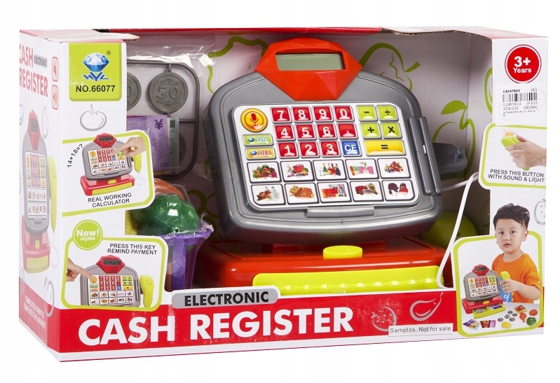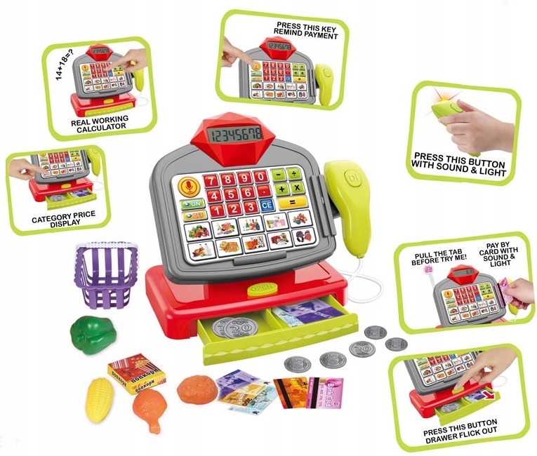Іграшка має вбудований калькулятор з функціями множення, додавання, віднімання та ділення. b> Касовий апарат має висувний ящик для грошей - просто натисніть кнопку "ВІДКРИТИ".