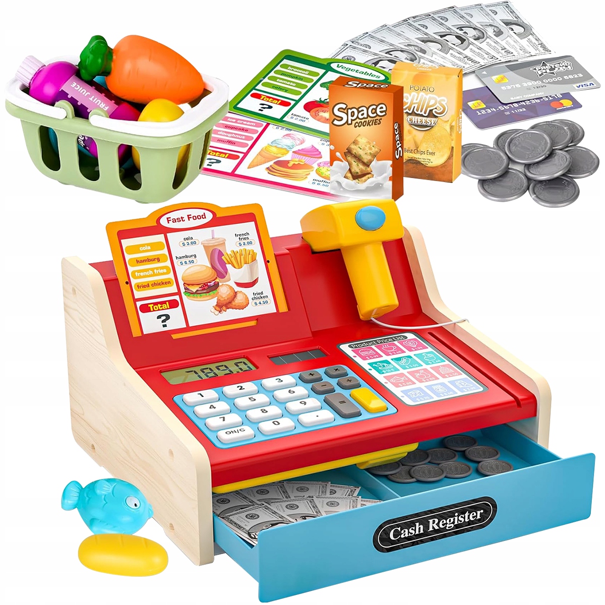 🧺【Набір преміум-класу, 30+ штук】Іграшка електричний касовий апарат включає: 1 сканер зі світлом/звуком, 1 кошик для покупок, 8 банкнот + 12 монет, 2 контейнери для закусок, кредитні картки/VISA, 2 меню, моделі їжі (овочі, хліб, риба) і напої. Реалістичний висувний касовий апарат доповнює враження від покупок - заохочує творчі здібності та навички імітації!