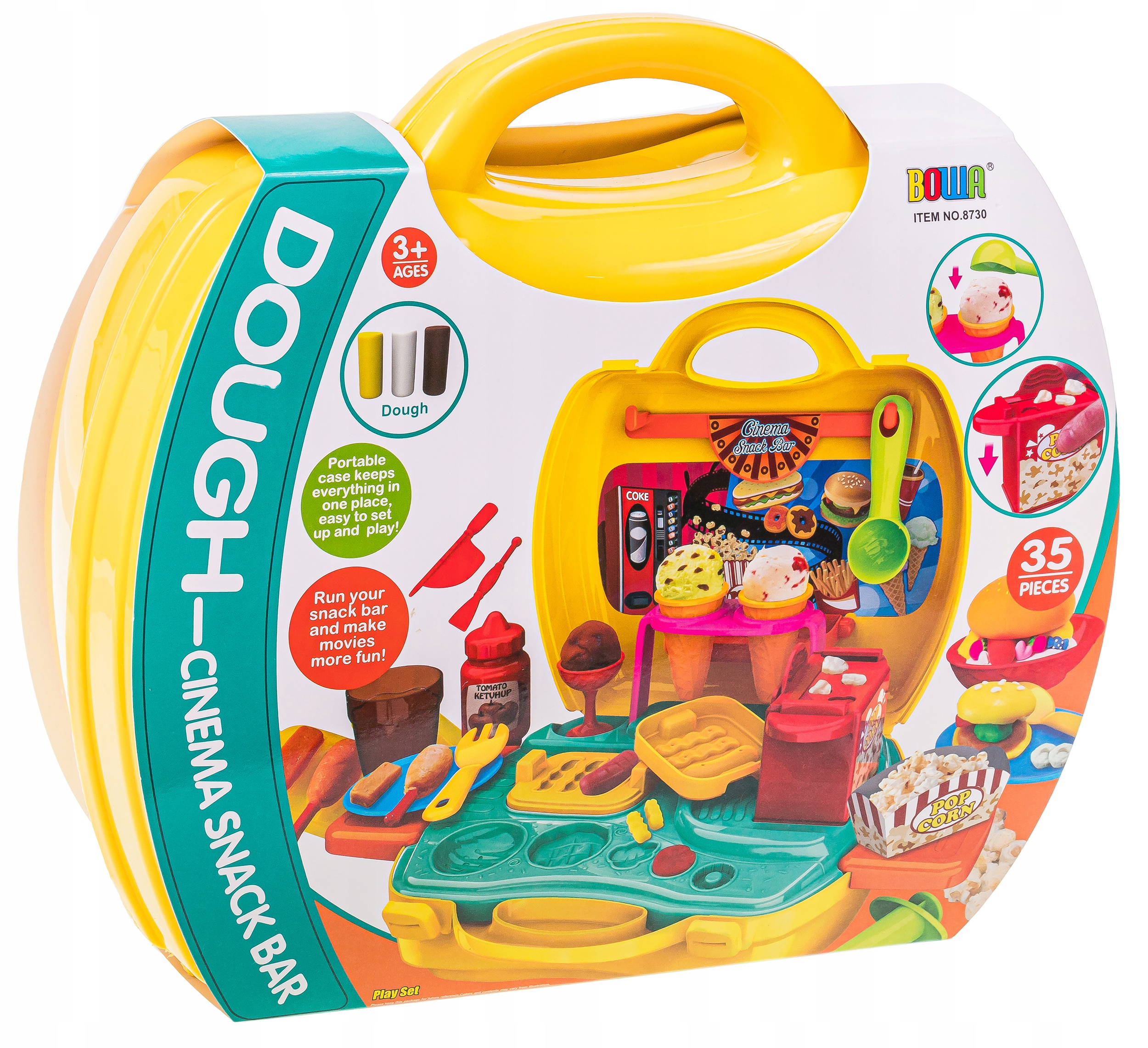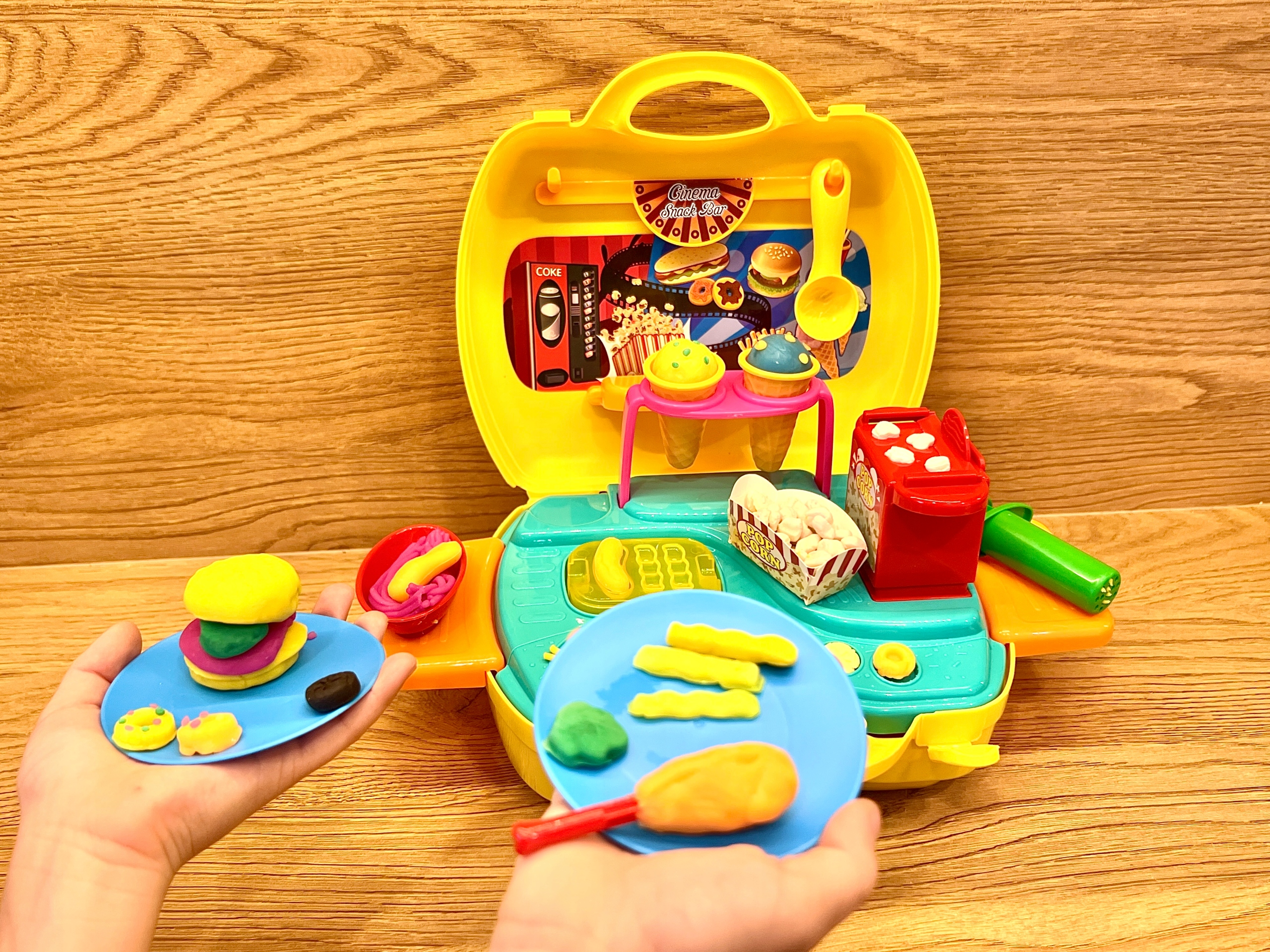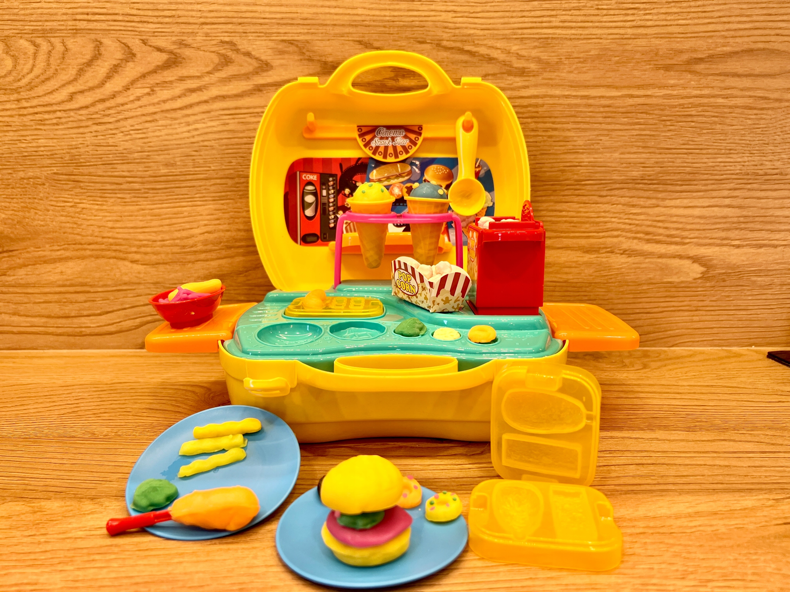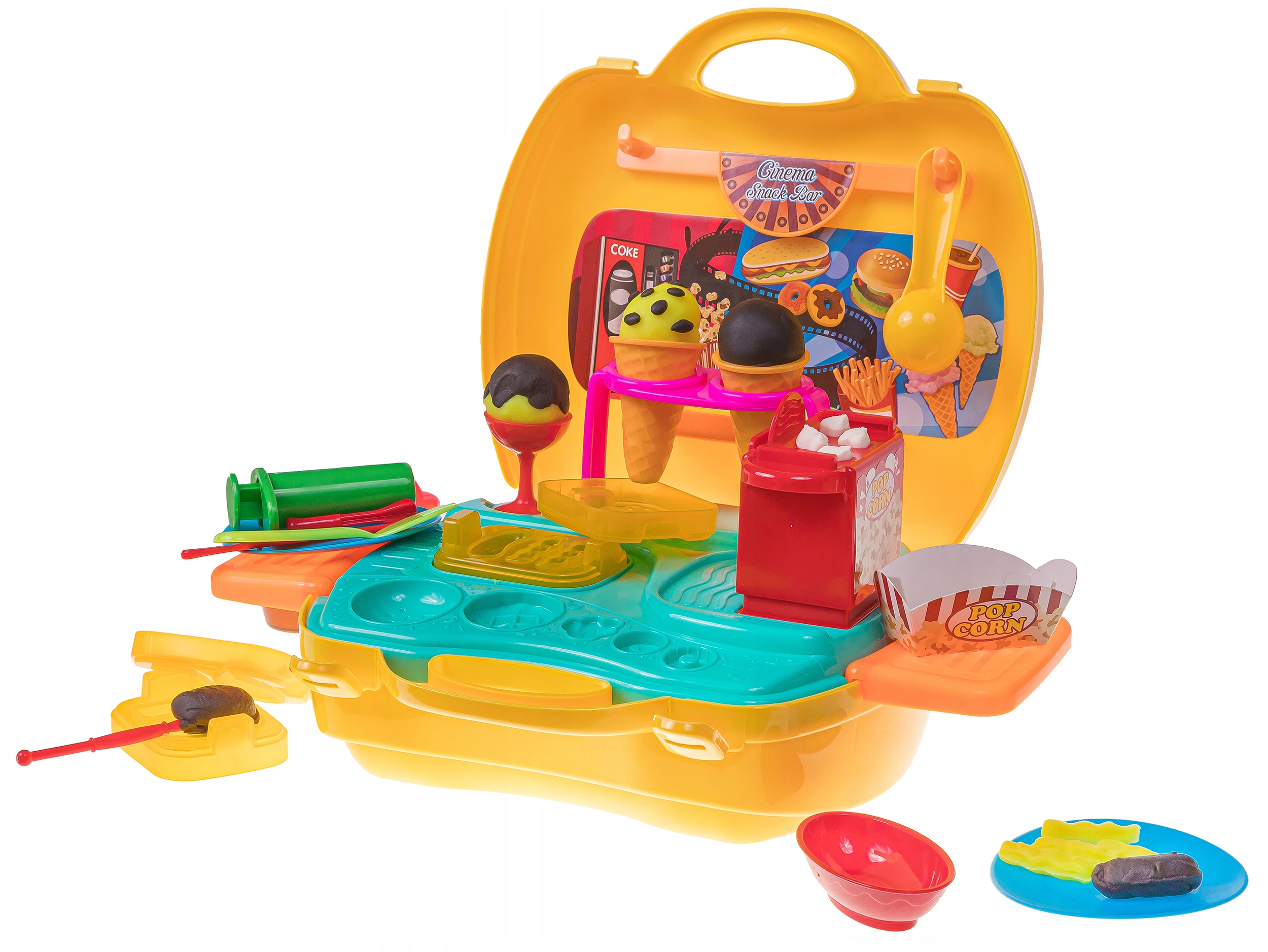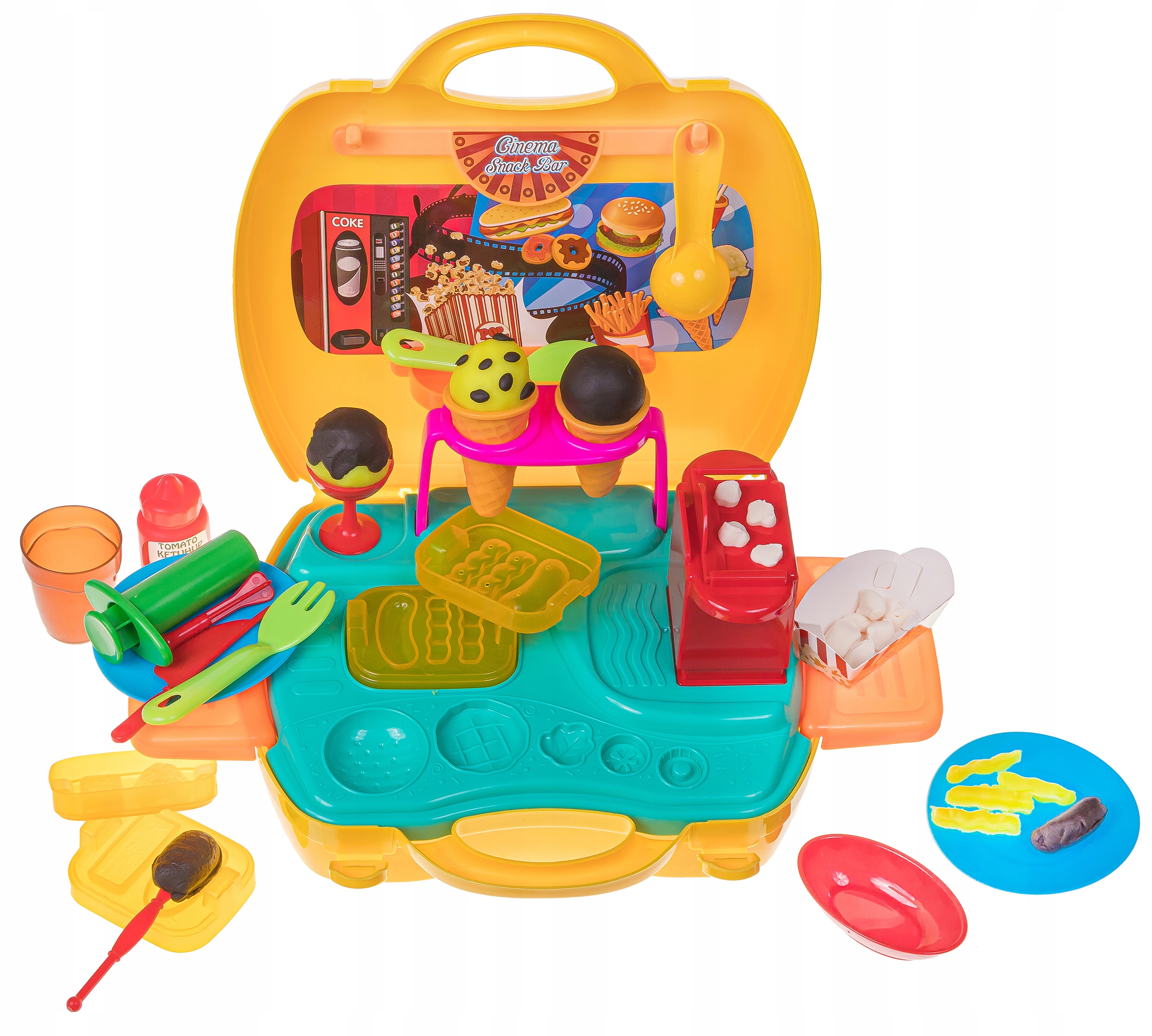 Набір містить 5 трубочок тіста для ігор різних кольорів та додаткові інструменти, такі як форми, ніж і ложки, що дозволить дитині створювати різноманітні фігури. Валіза також містить машину для віджиму морозива, форми для гамбургерів і аксесуари для приготування попкорну.