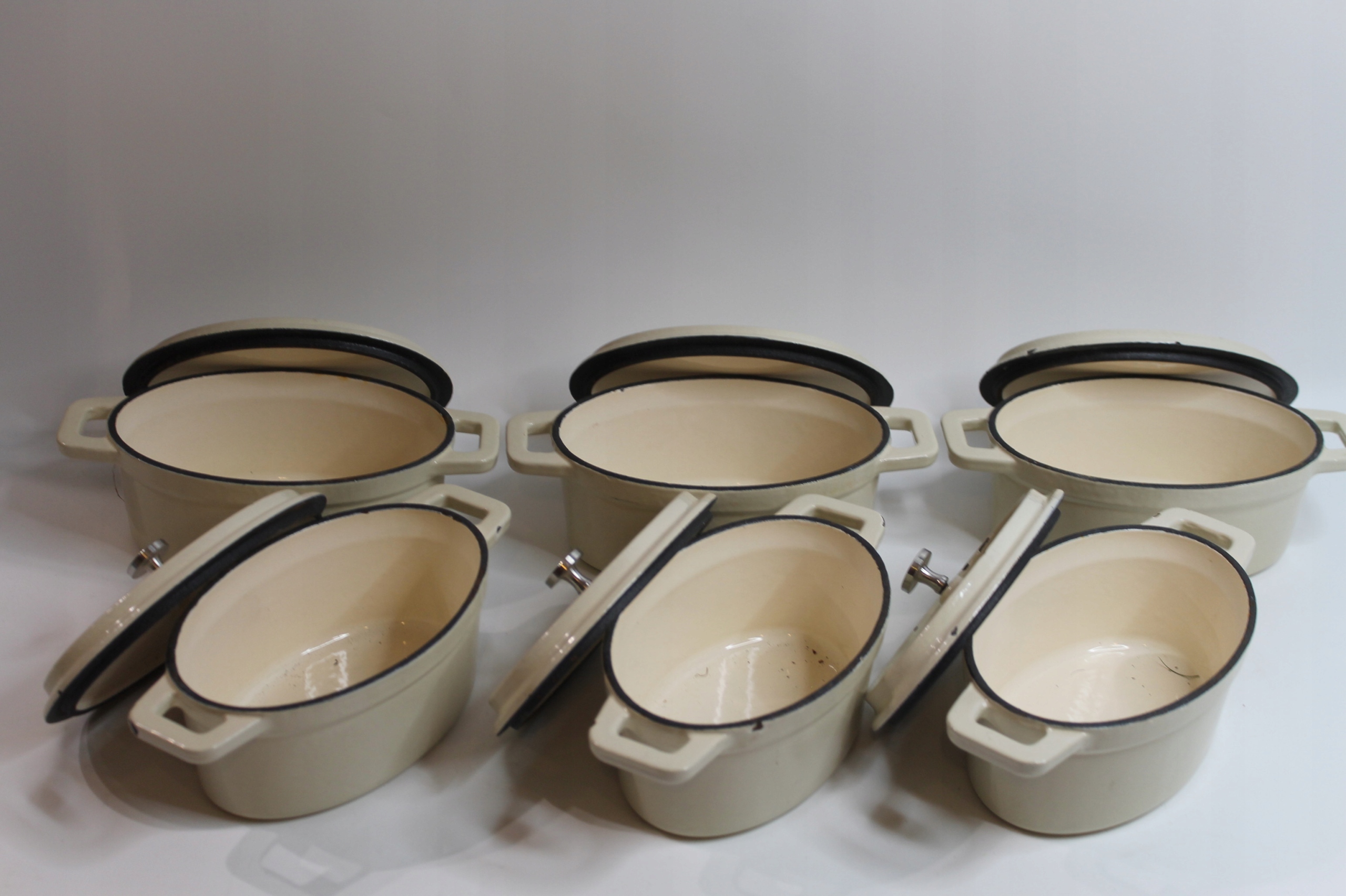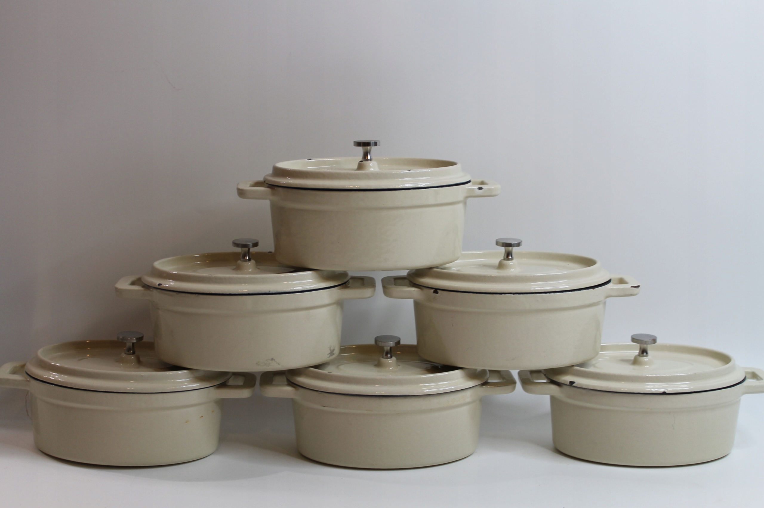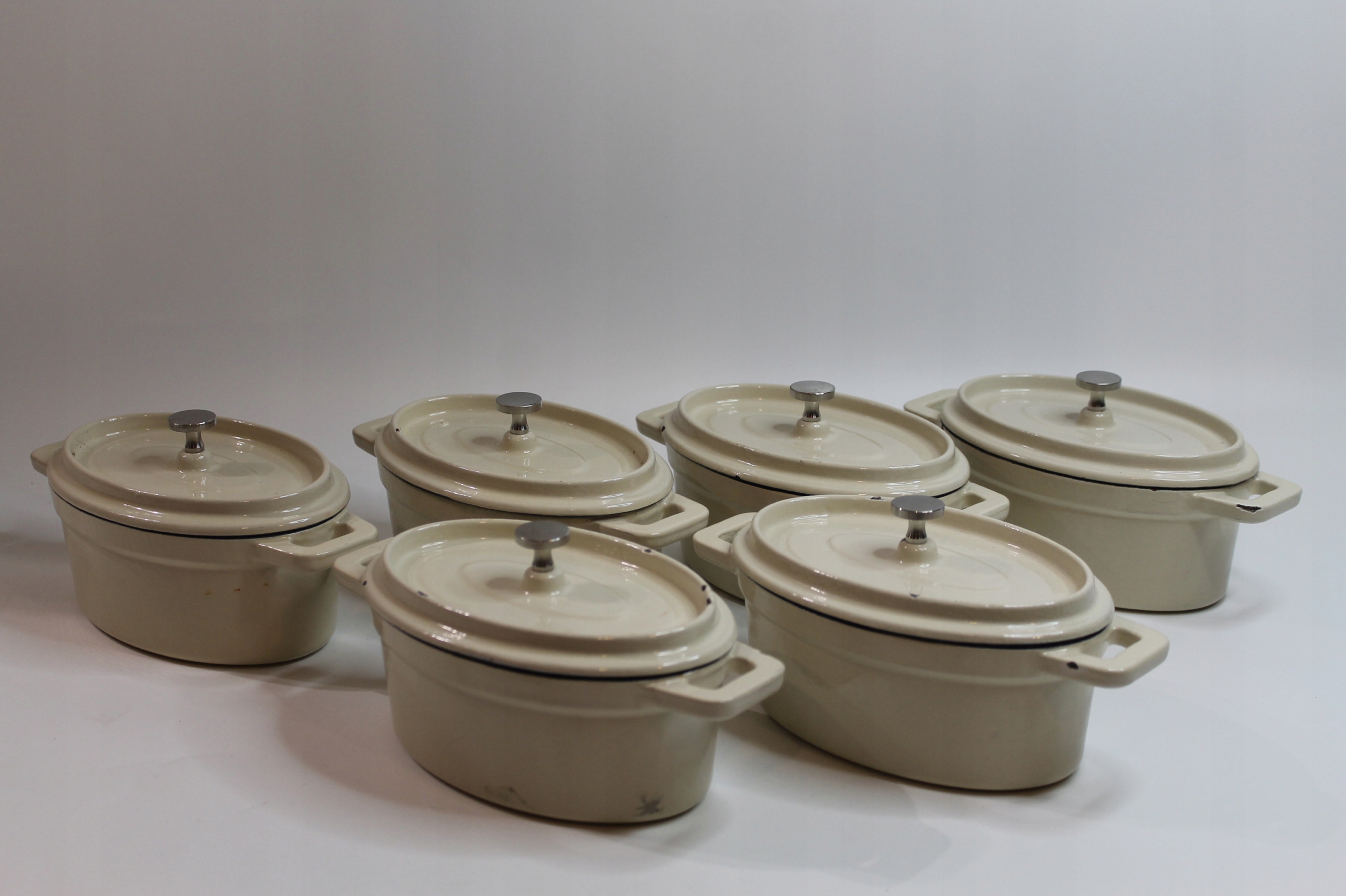 Предметом продажу є набір із шести невеликих чавунних каструль.