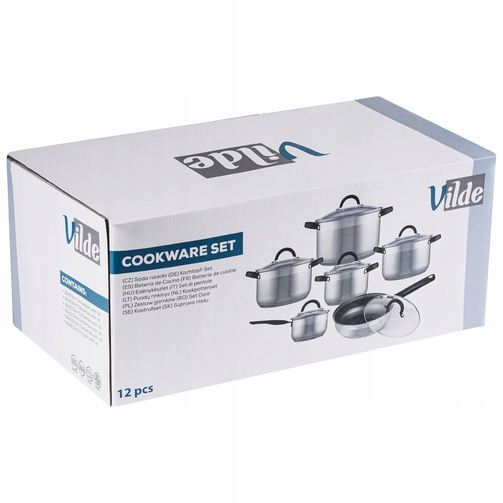 Набір посуду, що складається з дванадцяти елементів. У набір входить: каструля ємністю 1,5 л (загальна корисна ємність 1,6 л, діаметр 16 см, висота 10 см, висота з кришкою 15,5 см), каструля ємністю 2 л. (загальний об'єм 2,3 л, діаметр 18 см, висота 11 см, висота з кришкою 16,5 см), каструля ємністю 3 л (загальний об'єм 3,2 л, діаметр 20 см). , висота 12 см, висота з кришкою 18 см), каструля ємністю 5 л (загальна корисна ємність 5,5 л, діаметр 24 см, висота 14 см, висота з кришкою 20 см), каструля ємністю 1,5 л (загальна корисна ємність 1,7 л, діаметр 16 см, висота 10 см, висота з ручкою 11,5 см) та каструля діаметром 24 см(шир. 25,5 см, довжина з ручкою 44,5 см, висота 6,5 см). Посуд ідеально підходить для варіння, смаження і тушкування, в ній можна готувати різні страви. Набір горщиків має елегантний зовнішній вигляд і надзвичайно ефектно виглядає на кухні та при подачі страв прямо на стіл. Ідеальна ідея подарунка для ваших близьких. Оригінальна продукція Vilde. Виготовлена відповідно до європейських стандартів.