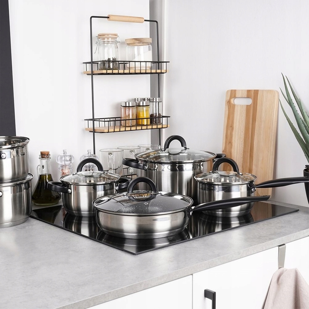 ✅ STEEL - Набір каструль і кришок, що складається з 12 елементів: чотири каструлі, каструля, сковорода з гранітним покриттям і шість кришок. Каструлі виготовлені з нержавіючої сталі найвищої якості. Зовні вони матові, з додатковою блискучою смугою вгорі, а внутрішня частина горщика відполірована до блиску. Сковорода має антипригарне гранітне покриття. Каструлі в наборі мають різну місткість і додатково оснащені кришками зі скла і нержавіючої сталі. Ручки зі сталі з порошковим покриттям, чорного матового кольору.