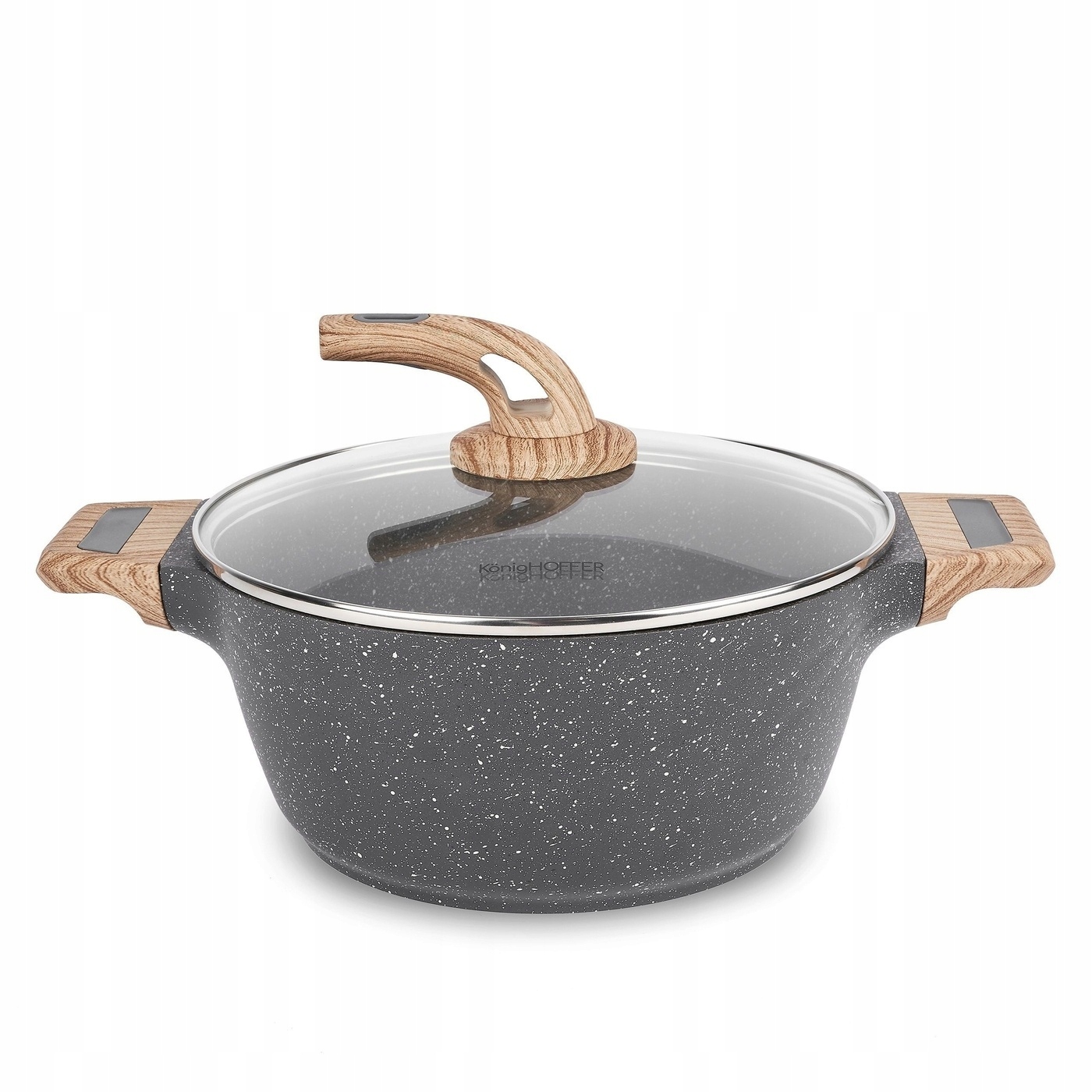 Каструля з алюмінієвим корпусом з гранітним покриттям, soft-touch ручкою і скляною кришкою Konighoffer Fegato з покриттям Greblon® C3 Granite 24 см 4 л - це інвестиція на роки. Його міцність і стійкість визначається кам'яним покриттям Greblon® C3 Granite, що складається з трьох шарів: базовий шар, захисний шар - 4 зірки (8000 циклів - в 4 рази більше, ніж стандартна сковорода з антипригарним покриттям); відповідне покриття, що надає колір і антипригарний ефект (non-stick) і захисний шар з характерним ефектом граніту (5 зірок). Сировина не містить похідних тефлону (PFOA Free) гарантує довговічність, стійкість і легке очищення. Виготовлена з алюмінію і скляна кришка, що закриває циркуляцію, гарантує швидке приготування страв. Мармурова каструля підходить для будь-якої плити (газова, електрична, керамічна, індукційна). М'які на дотик ручки, які залишаються теплими (каструля, кришка), забезпечують безпечне та комфортне приготування їжі. Все виглядає чудово. Продукт рекомендований Ewa Wachowicz. Як амбасадор бренду Konighoffer, вона тепло та з усмішкою рекомендує його для домашнього використання. Разом з ним ви отримаєте свій рецепт для дому. Це один із найкращих варіантів у цій категорії!