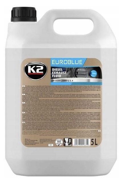 K2 EUROBLUE — це водний розчин сечовини, який використовується в дизельних двигунах із використанням технології селективного каталітичного відновлення (SCR). Зменшує викиди шкідливих для навколишнього середовища оксидів азоту (NOx). Перед використанням переконайтеся, що продукт щільно закритий. Неушкоджена пломба гарантує оригінальність і найвищу якість товару. Тримайте упаковку щільно закритою. Не допускайте розливання рідини. Будь-яку пролиту рідину негайно витріть вологою тканиною. Продукт не класифікується як небезпечний для здоров'я людини або навколишнього середовища. Рекомендована температура зберігання продукту від -11,5°C до 30°C, слід уникати потрапляння прямих сонячних променів. У разі потрапляння на шкіру промити великою кількістю води. У разі потрапляння в очі ретельно промийте водою протягом кількох хвилин і зверніться до лікаря.