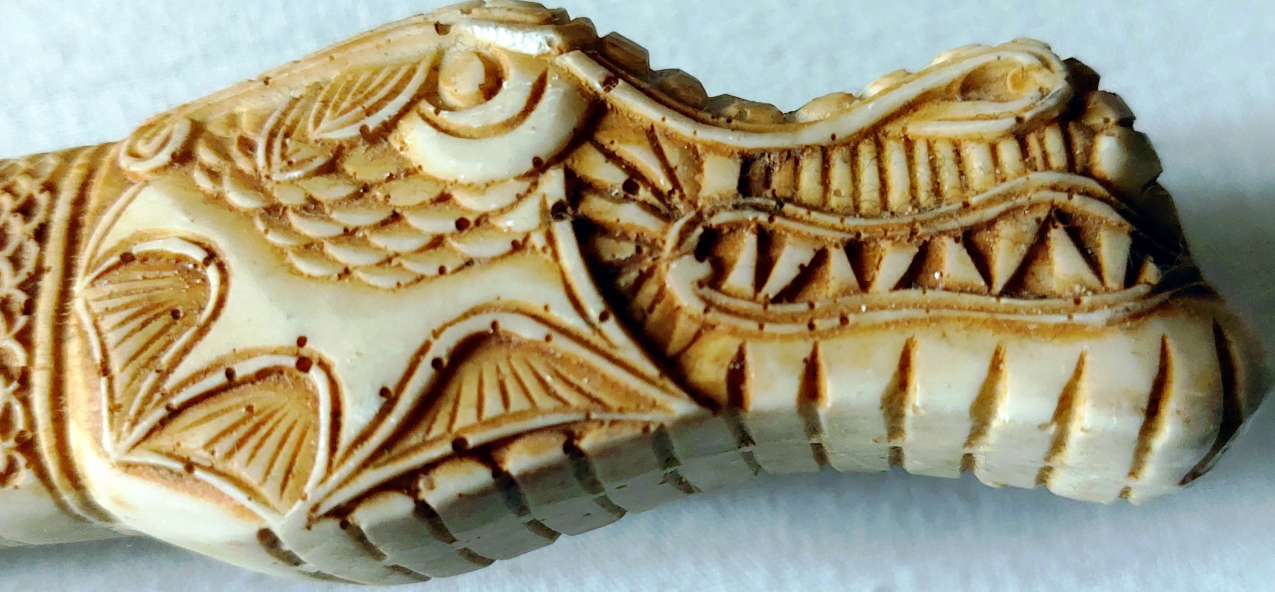 Похви виготовлені з дерева, покритого воском ручної різьби, що нагадує слонову кістку або її імітацію. Скульптури зображують сцени людей у традиційних костюмах, драконів та інші елементи, характерні для іконографії Східної Азії. Це символи захисту, сили та благородства, особливо в мистецтві, пов’язаному зі зброєю.