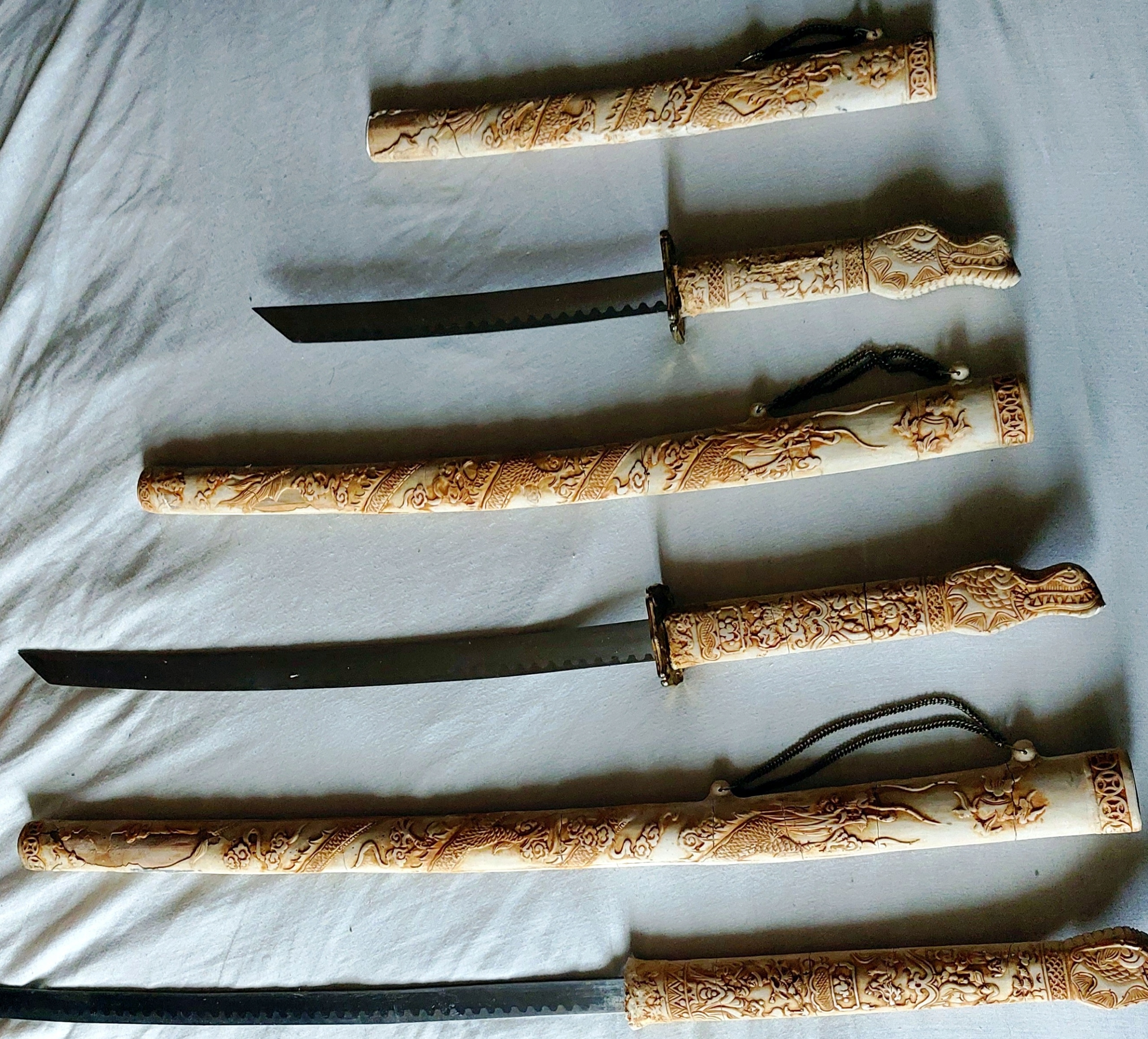 Щастя та благословення! У набір входять три кинджали дайто + вакізасі + танто та три багато прикрашені дерев'яні піхви, вкриті воском ручної різьби.