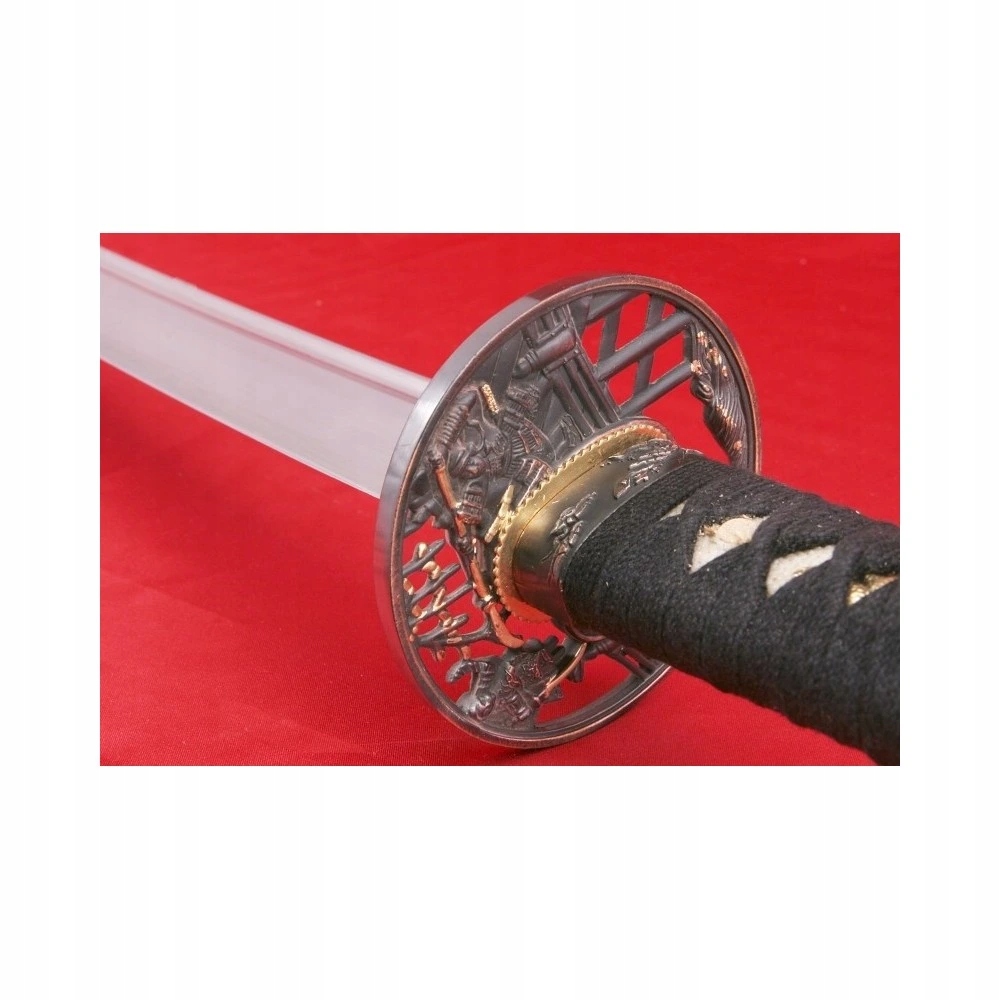 - Цука: (ручка) дерев’яна серцевина, обгорнута справжньою променевою шкірою (Самегава) з чорним обплетенням – Іто. Лезо катани закріплено двома мекугі (бамбуковими шпильками). Ви можете розібрати лезо з ручки, витягнувши ці штифти. З кожного боку цукі (ручки) є менюкі (орнамент під плетінням). Декорований чорний кінець ручки (кашира).
