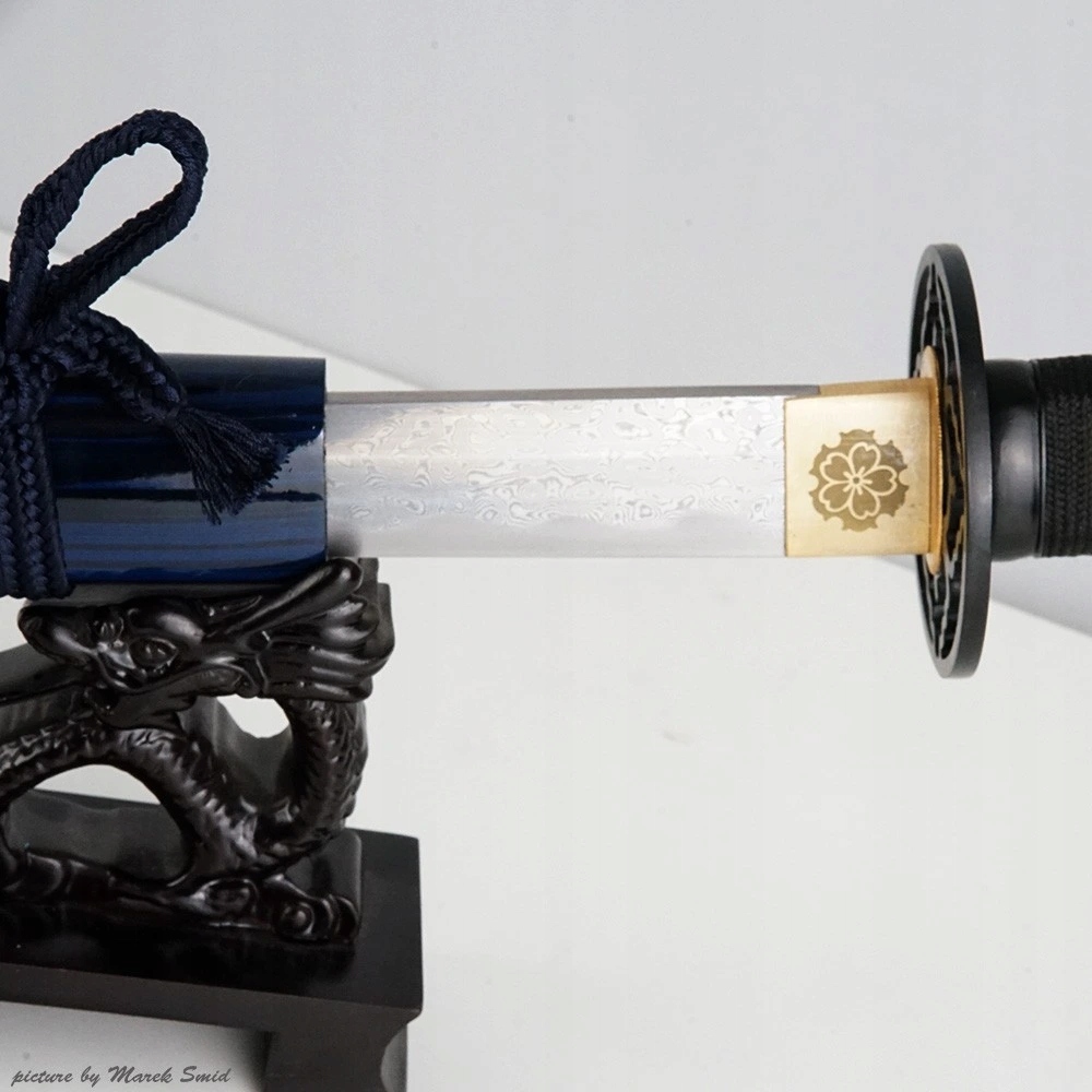 підроблений японський меч katana з відшліфованим наслідуванням загартовування (Бракона) та жолобом Бо-Хі. Гострий (ґрунтовий) самурайський меч Катани знайде своє використання як прикрасу, але також для активних вправ бойових мистецтв. Катана не підходить для скошування більш важких матеріалів. Сталь не частково хмарна (Хамон відшліфований лише) і тому має низьку твердість. Косиння жорстких матеріалів залишатимуть сліди на лезі меча. Привабливе і гостре лезо, темно -синій блискучий Сая плюс цука (ручка), яка покрита справжньою шкірою жало, все це робить цю катанку дуже цікавою і бажаною. Катана зберігається в полотні та паперовому коробці. Лезо Катани прикрашене відшліфованою наслідуванням лінії загартування Хамона. Компанія dellinger не несе відповідальності за збитки та пошкодження, заподіяні під час використання. Сховати катану поза досяжністю дітей! Кожне маніпулювання самурайським мечем відповідає за власною відповідальністю. Пам'ятайте, що у вас в руках фатальна зброя !
