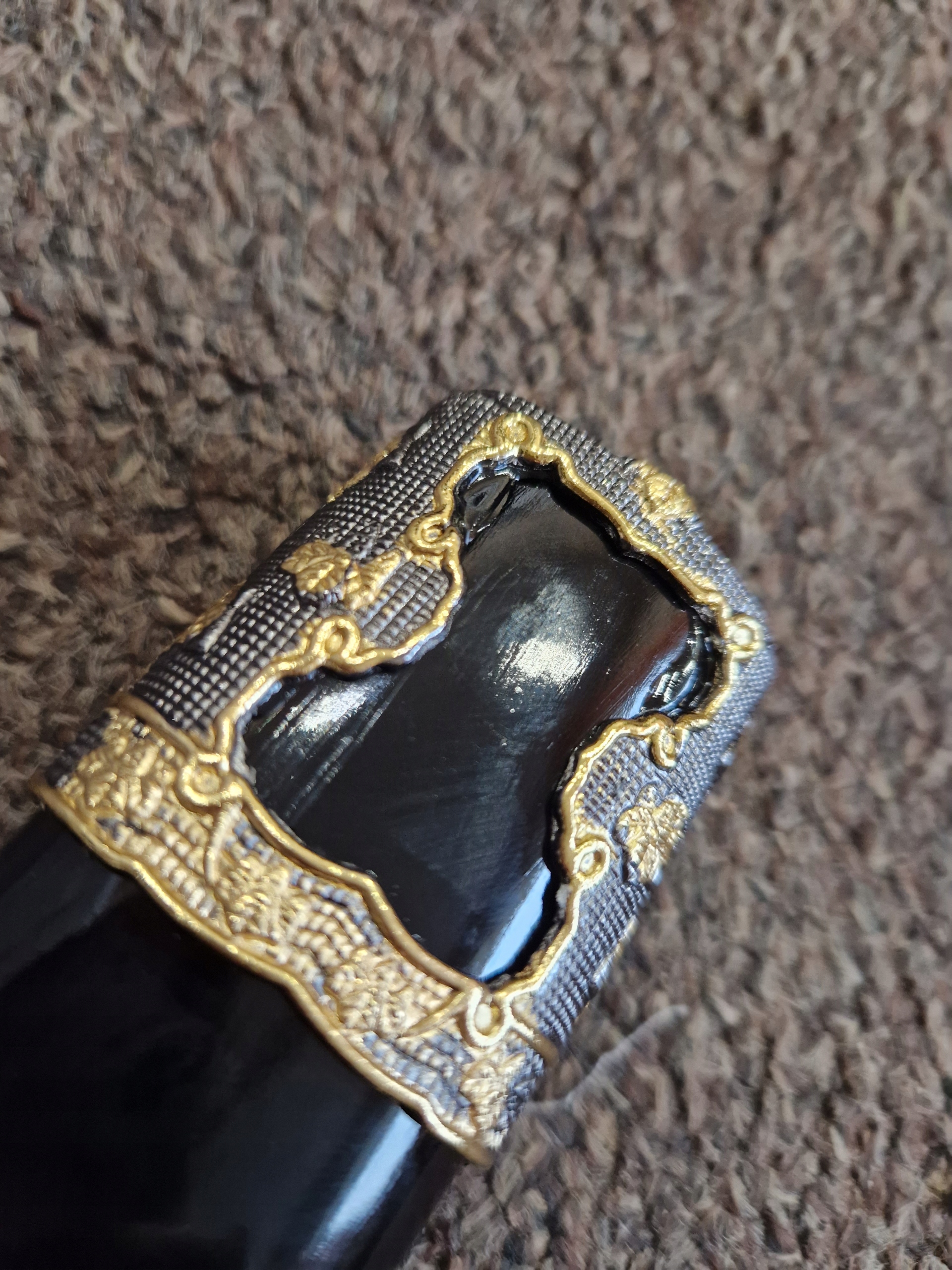 - НОЖНИ/ САЯ: Тверда деревина, розписана вручну в чорний колір, ручна різьба, чорна бавовняна оплетка на ручці, імітація шкіри ската, метал цуба.