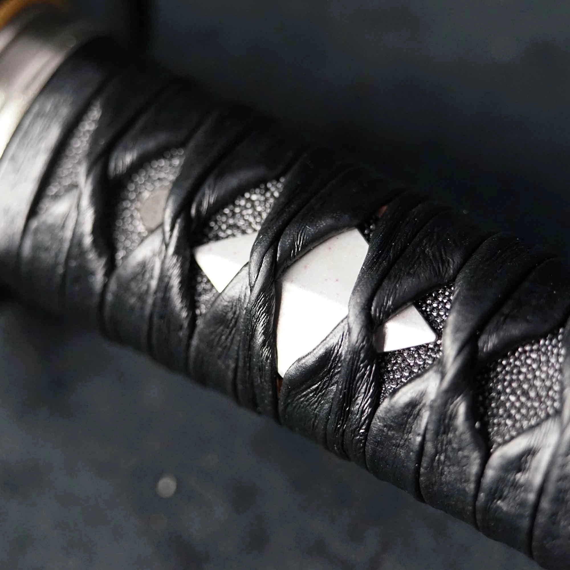 - Цука: (ручка) дерев’яна серцевина, обгорнута справжньою шкірою ската (Самегава) з чорною шкіряною опліткою – Іто. Лезо катани закріплено двома мекугі (бамбуковими шпильками). Ви можете розібрати лезо з ручки, витягнувши ці штифти. Кожна сторона Цукі (ручка) має менюкі (срібна прикраса під тасьмою). Характерні декоровані кінці ручок (кашира).