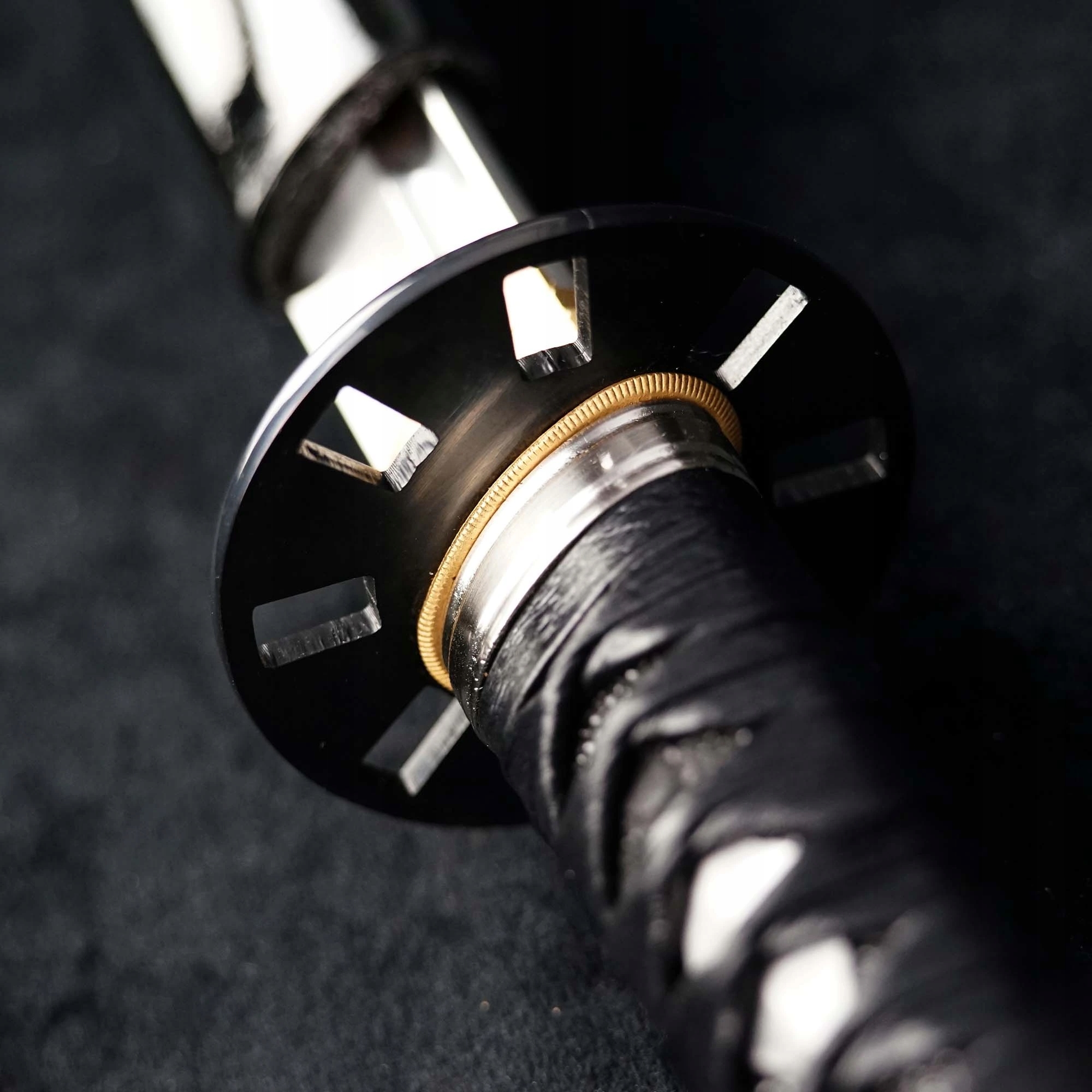 Кований клинок shinogi-zukuri з вуглецевої сталі AISI 1095 найвищої якості. Сталь у монокомпозитній конфігурації Maru - диференційоване гартування. Вуглецева сталь AISI 1095 дуже міцна і чудово тримає різкість. На завершальному етапі лезо з канавкою бо-хі було відполіровано вручну каменем хазуя - це призвело до майже гострого леза та дзеркального блиску. Це лезо було випробувано, щоб очищати все, що трапляється на його шляху! Sori (вигин леза) був спеціально розроблений для отримання найкращих і найчистіших надрізів. Вуглецева монокомпозитна сталь AISI 1095 має вражаючу твердість (хасакі) приблизно 58 HRC - ідеальне поєднання цієї твердості підкреслюється кривизною леза Sori, яке дозволяє легко різати татамі, солом'яні циновки або бамбук для тамесігірі. Full tangконструкція цього леза значно збільшує сила меча.