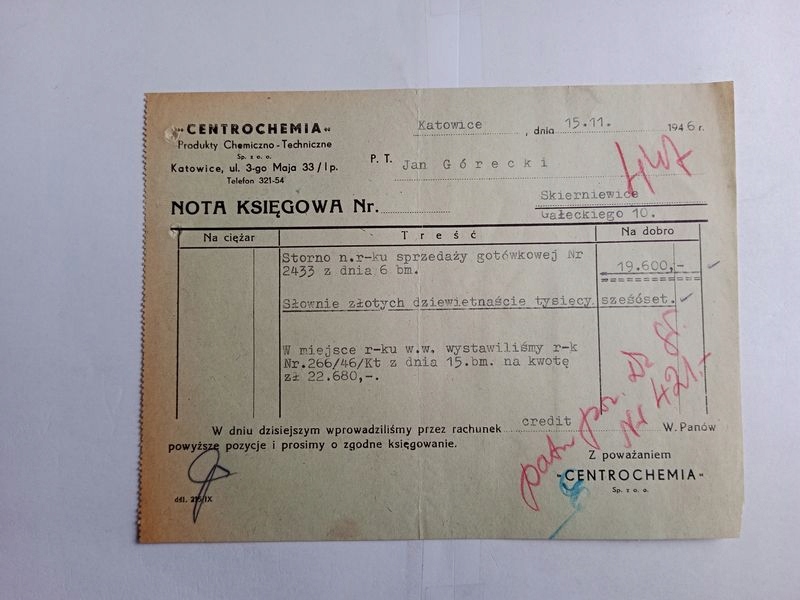 БУХГАЛТЕРСЬКА ПРИМІТКА KATOWICE CENTROCHEMIA 1946 R 0092 D