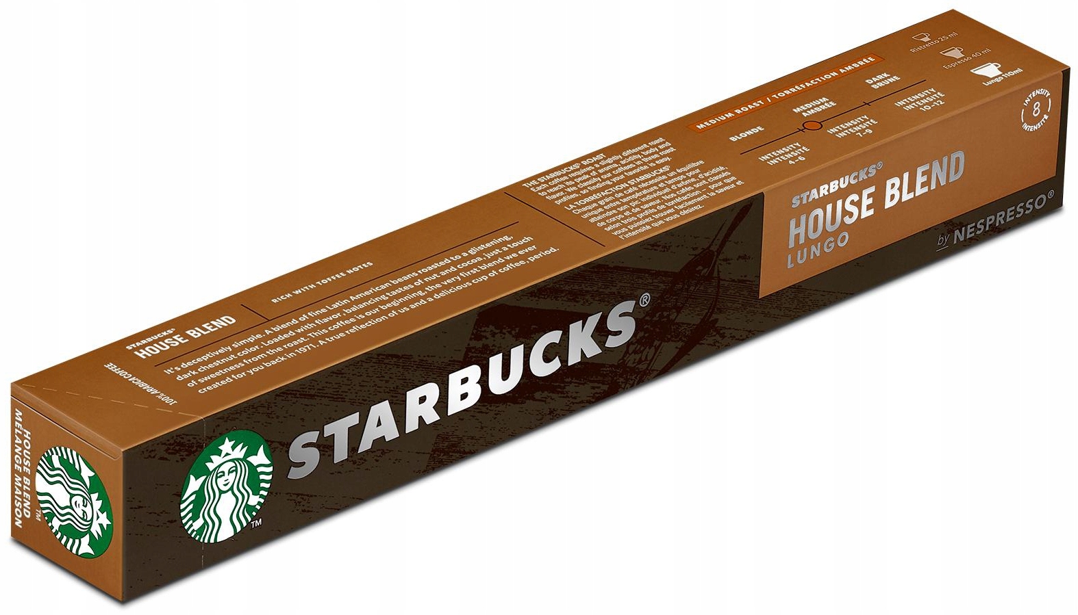 Цей варіант називається House Blend і є першою кавою, створеною компанією Starbucks, і з тих пір її використовують. Кава походить із Південної та Центральної Америки та має 100% арабіку середнього обсмаження. Невелике обсмаження надає м’який карамелізований смак з горіховими нотами та легкою солодкістю. Цей Starbucks для Nespresso рекомендується як лунго.