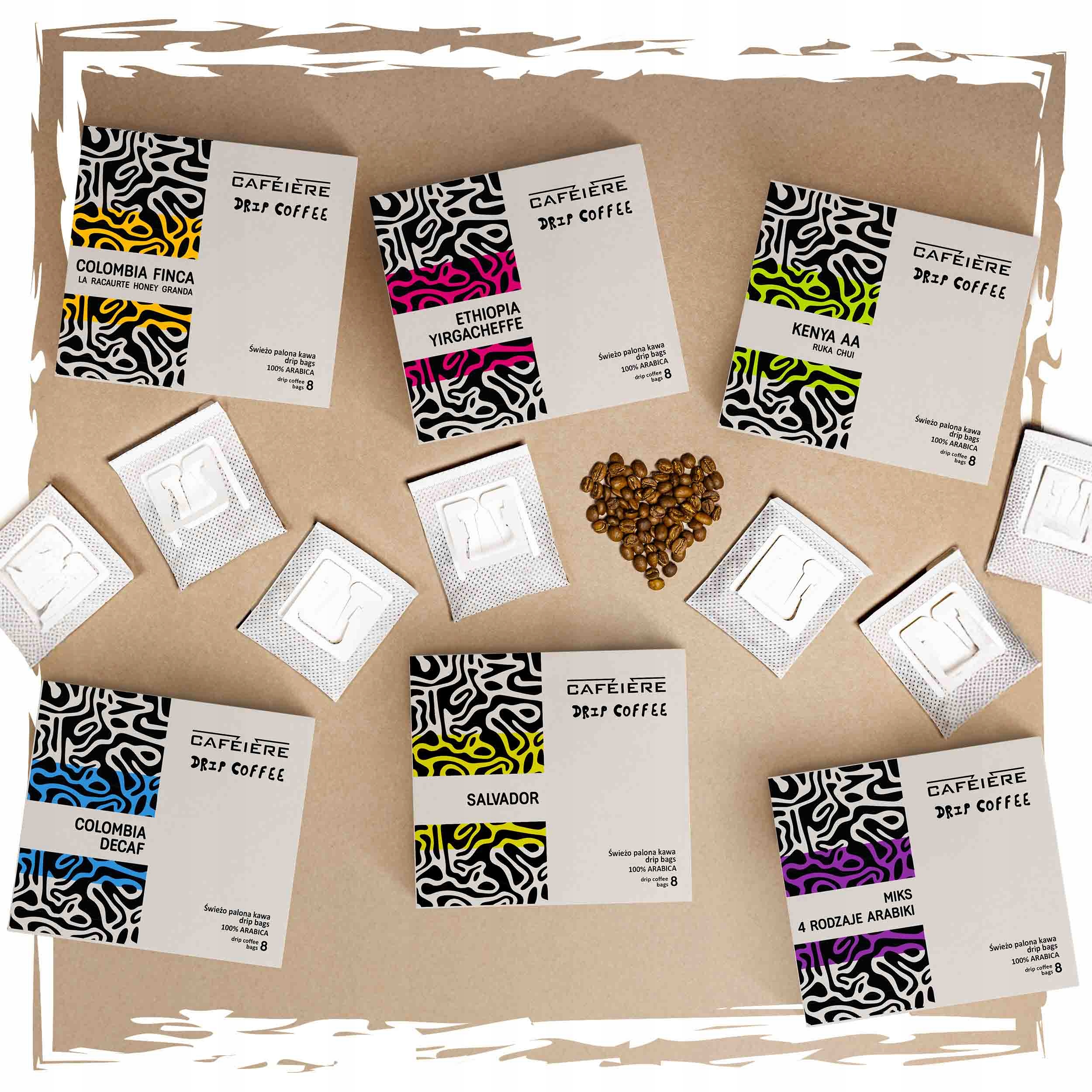CAFEIERE DRIP COFFEE - Колумбія без кофеїну. 8 пакетиків, 100% арабіка, свіжозмелені та щільно упаковані. Ідеально підходить для вечора - без кофеїну.