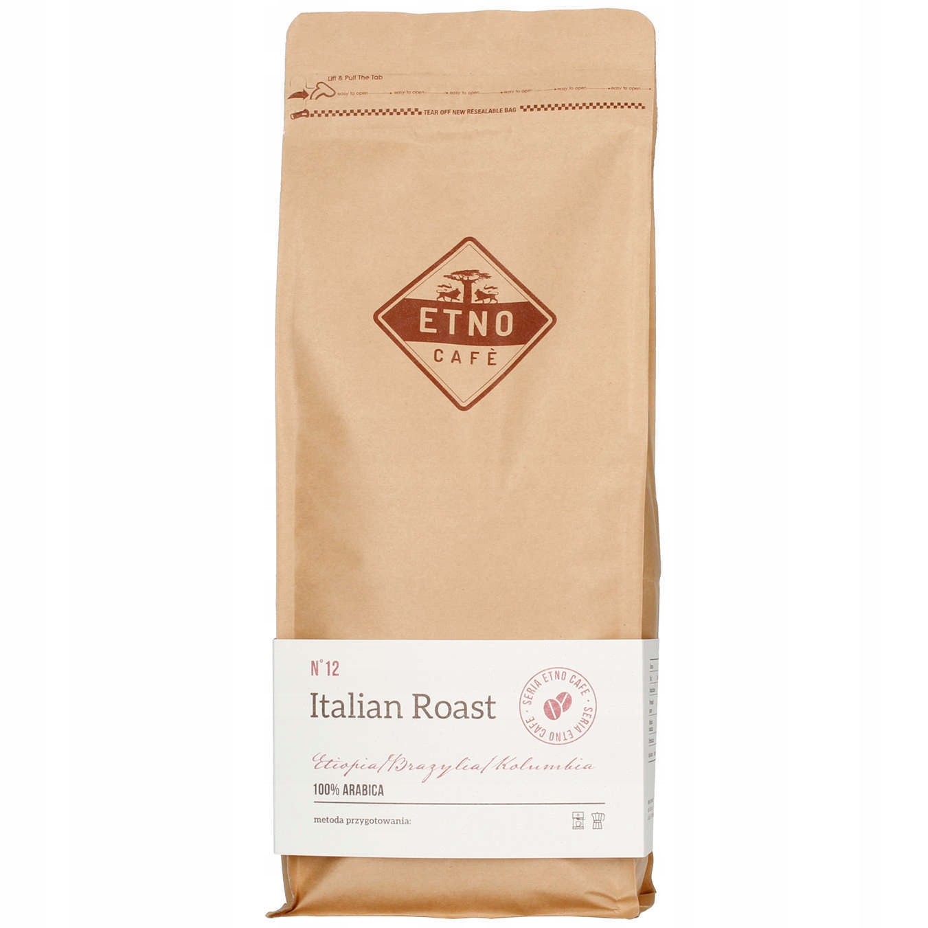 Etno Cafe Italian Roast кава в зернах - це суміш 100% зерен арабіки, які походять з різних географічних регіонів світу. Ступінь його темного обсмаження забезпечує дуже інтенсивний аромат і смак чудового густого шоколаду. Etno Cafe Italian Roast кава в зернах готується в портафільтрах і автоматичних кавомашинах. Після належного помелу він придатний для заварювання в кавниках або френч-пресі.