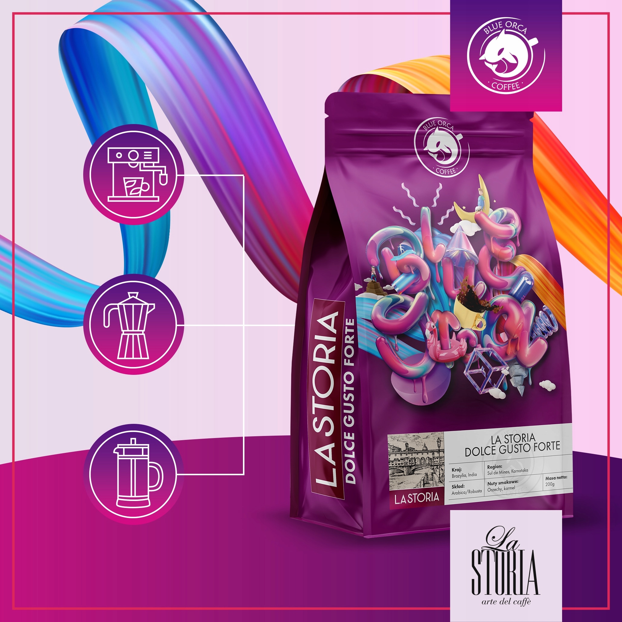 DOLCE GUSTO FORTEз сімейства La Storia буде трохи менш ароматною кавою, ніж інші, які використовують 100% зерна арабіки, але точно доставте найвищу дозу кофеїну