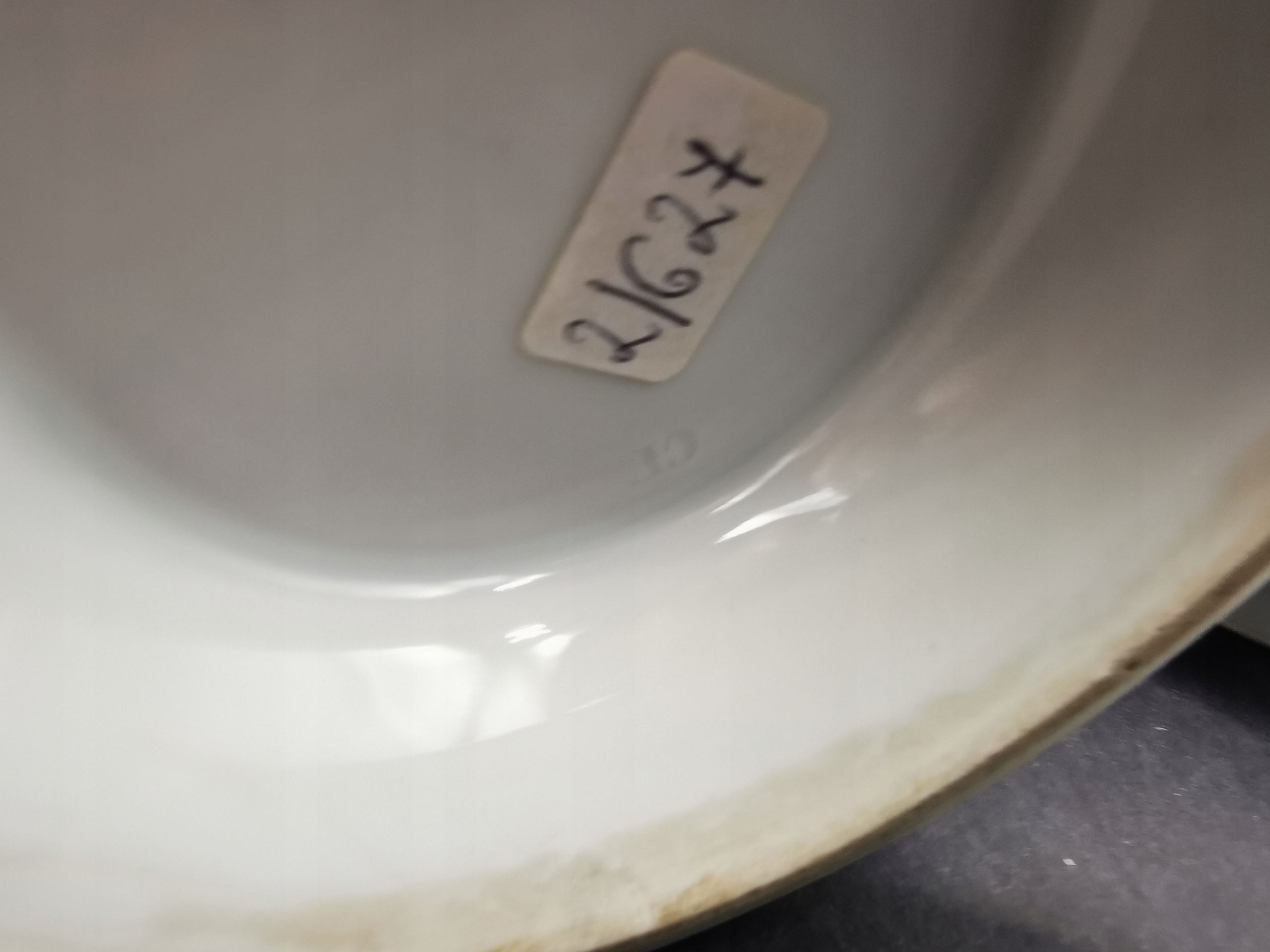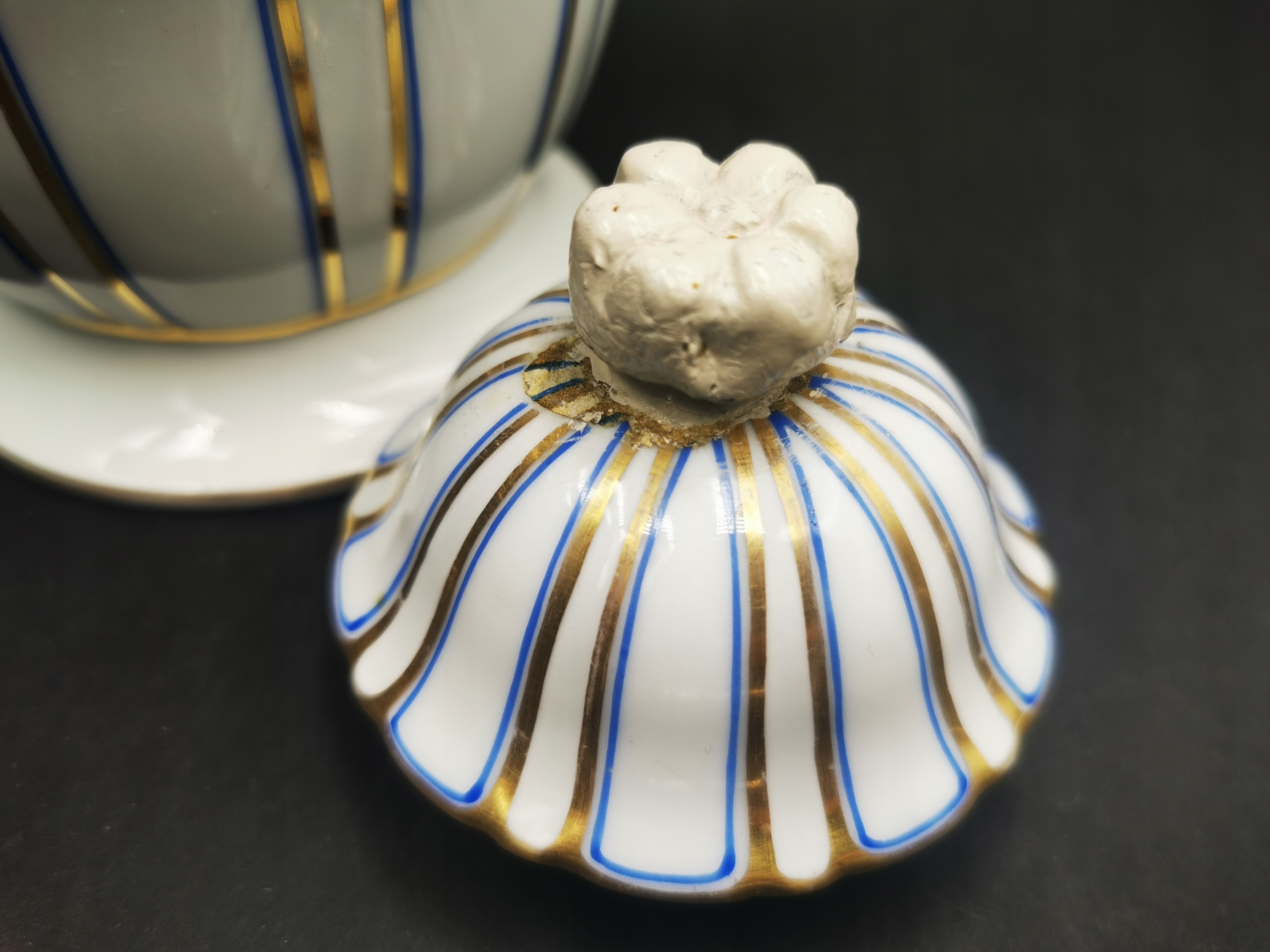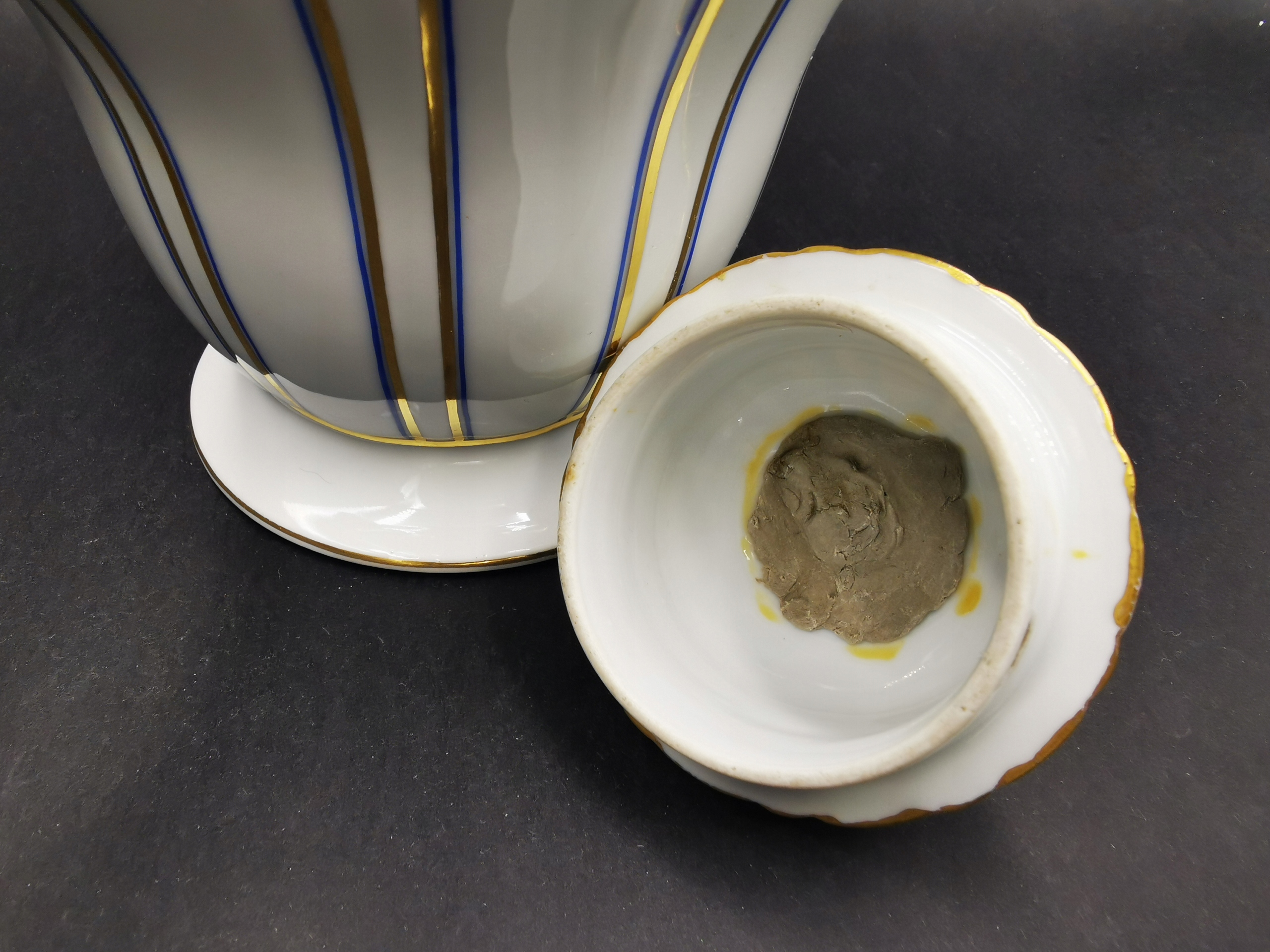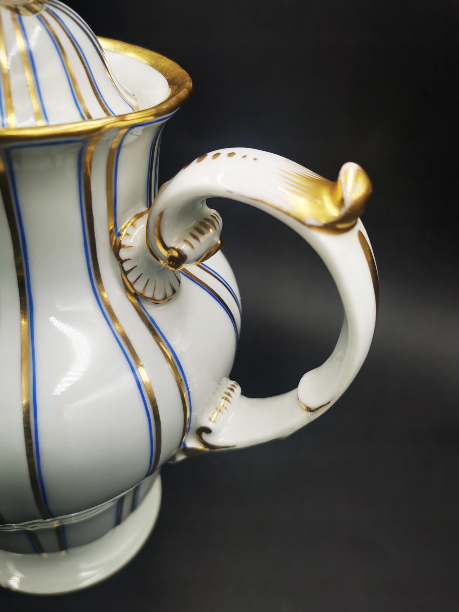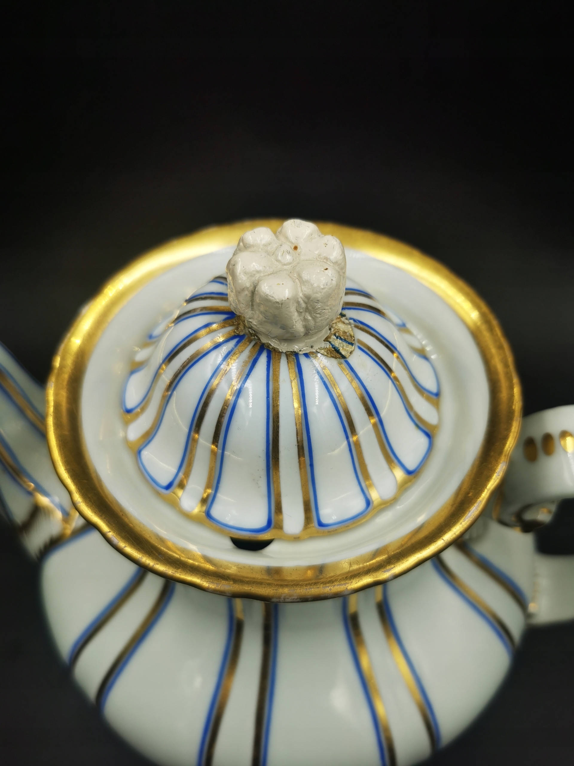 Представлений глечик є рідкістю на антикварному ринку, на ньому є відбитковий знак CF, який використовувався фабрикою в 1846-1857 роках. Бренд був заснований в 1803 році з ініціативи Фрідріха Хольке і Йоганна Готлоба Ліста в Чехії. село Піркенхаммер (сьогодні Брезова) біля Карлових Вар. Після 1811 року назва Friedrich Höcke була змінена на Fischer & Reichenbach за прізвищами нових власників. У 1831 році управління прийняв син покійного Мартіна Фішера - Крістіан. Компанія отримала золоту медаль на Всесвітній виставці у Відні в 1839 році. Глечик має сліди ремонту квіткового акценту на кришці глечика, але він все ще неймовірно чарівний. Золоті та сині смуги, що проходять від основи до кришки, додають витонченості з видимими слідами часу та віку - пошкодження основи глечика.
