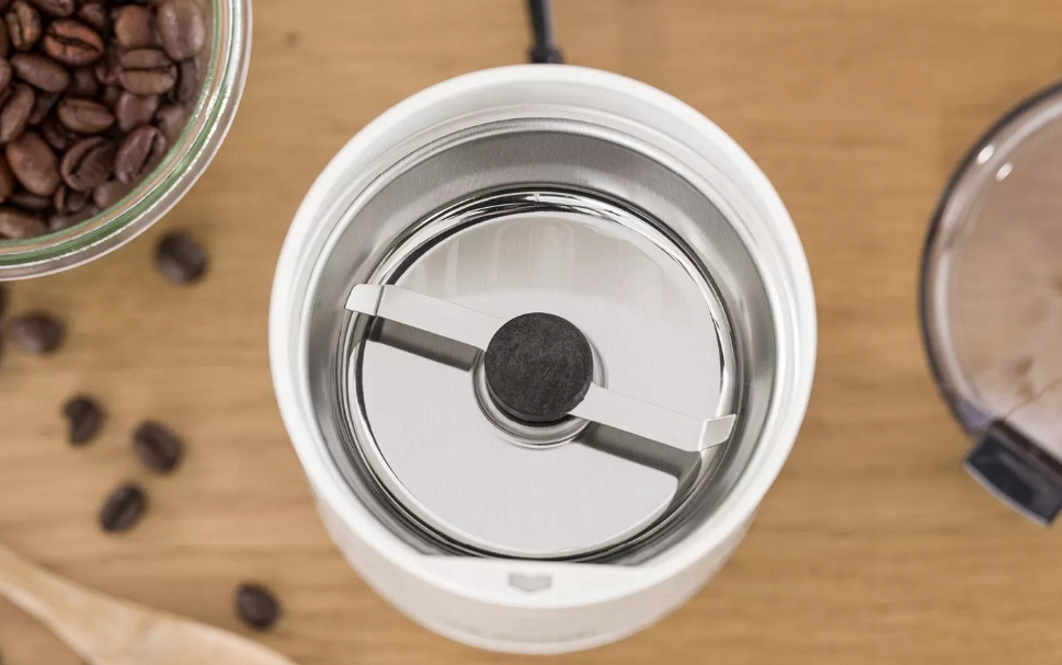 Подрібнювач з ножем з нержавіючої сталі забезпечує високу точність і тонкий помел. У них була лише одна із закритою кришкою. Кнопка для запобігання випадковому натисканню.