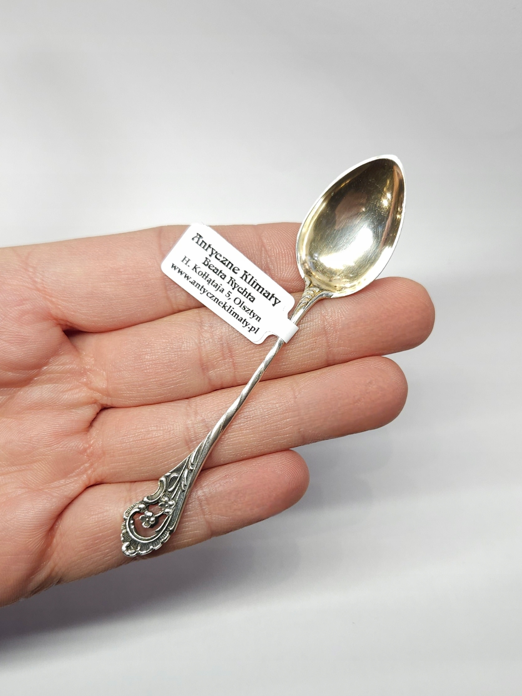Ложка срібна з ажурною ручкою, оздоблена квітковим мотивом, у стилі бароко та злегка позолоченим ковшом; Через вік можливі дрібні мікроподряпини