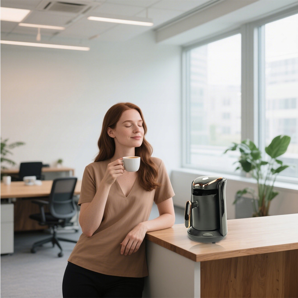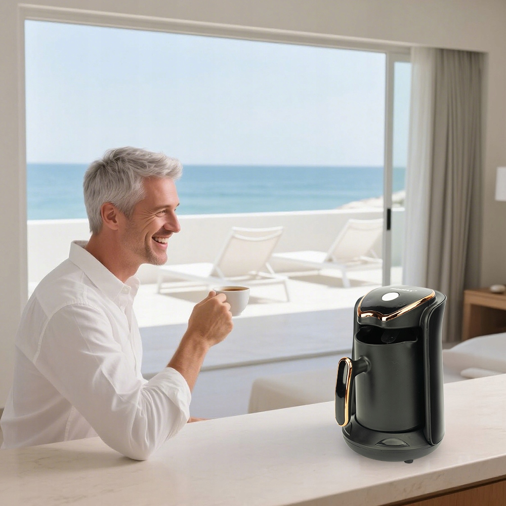 Кавник для турки оснащений кнопкою та зручною ергономічною ручкою для зручності перенесення. Протиковзка основа забезпечує більшу стабільність і зручність використання.
