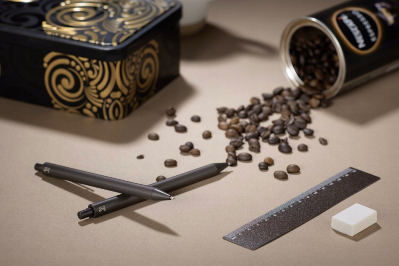 Набір складається з ручки, механічного олівця та лінійки з матеріалу, що містить кавові зерна, а також набір доповнено класичною гумкою.