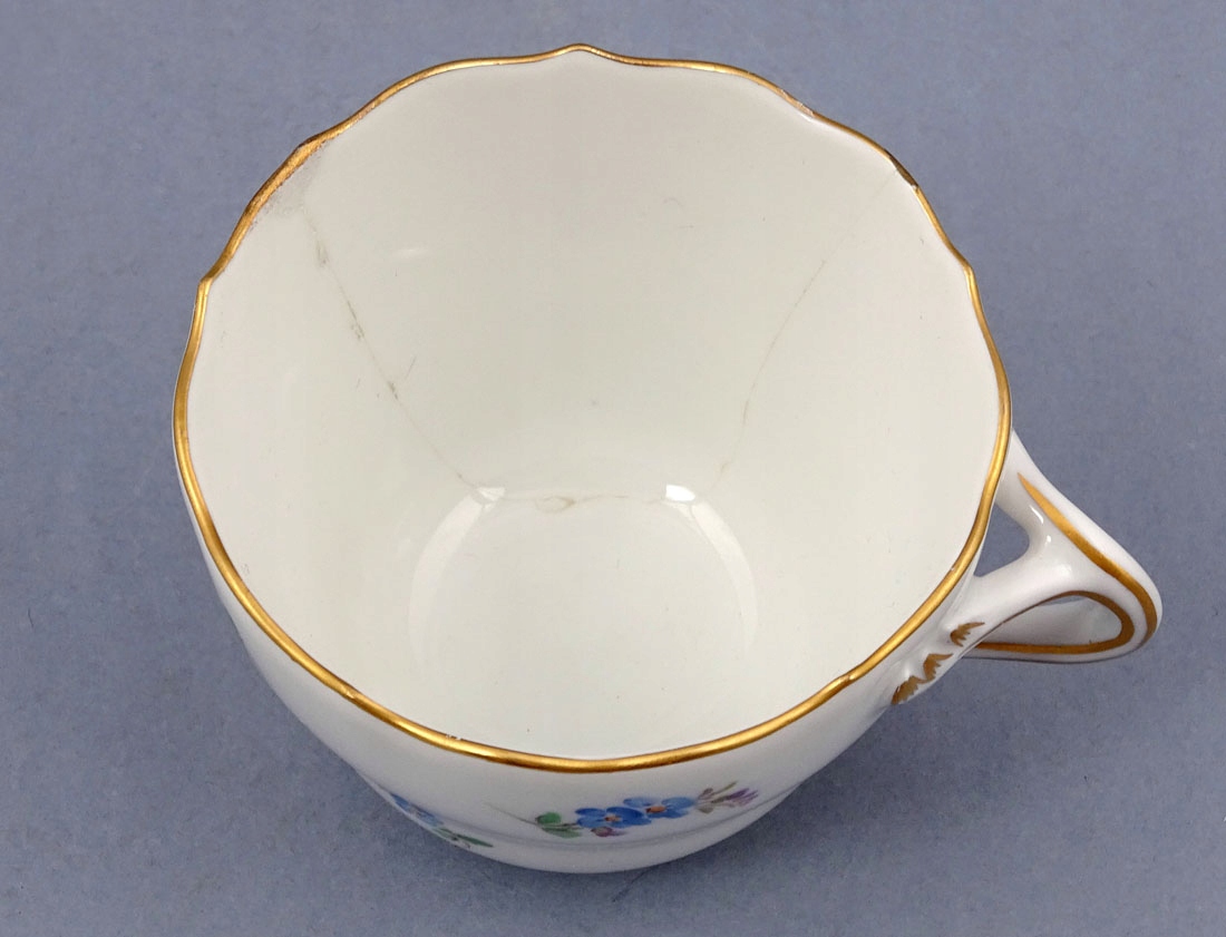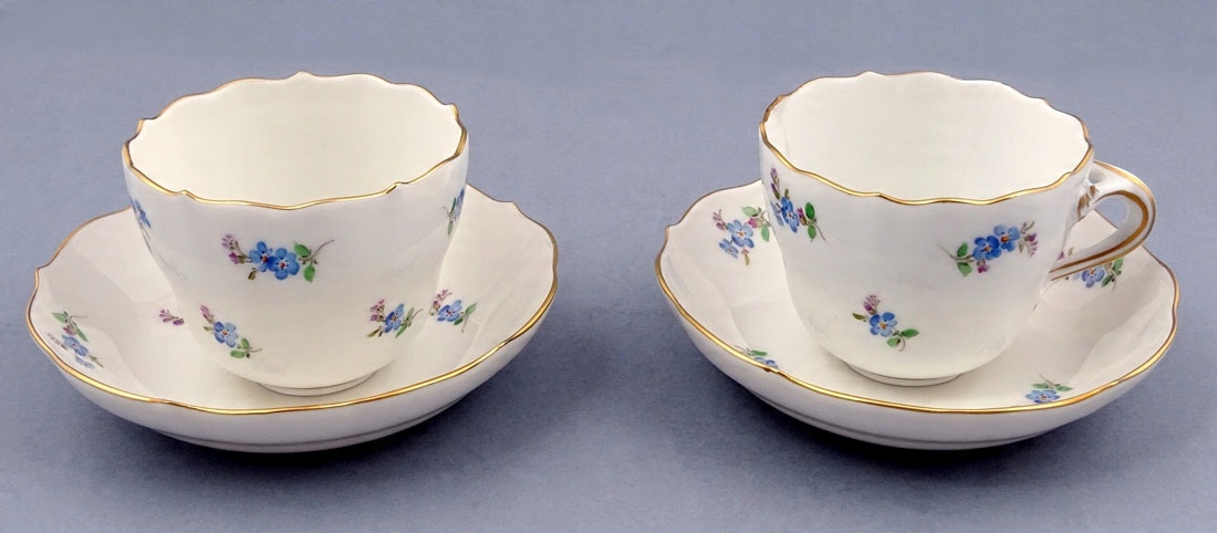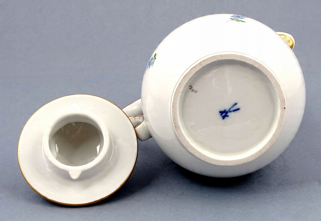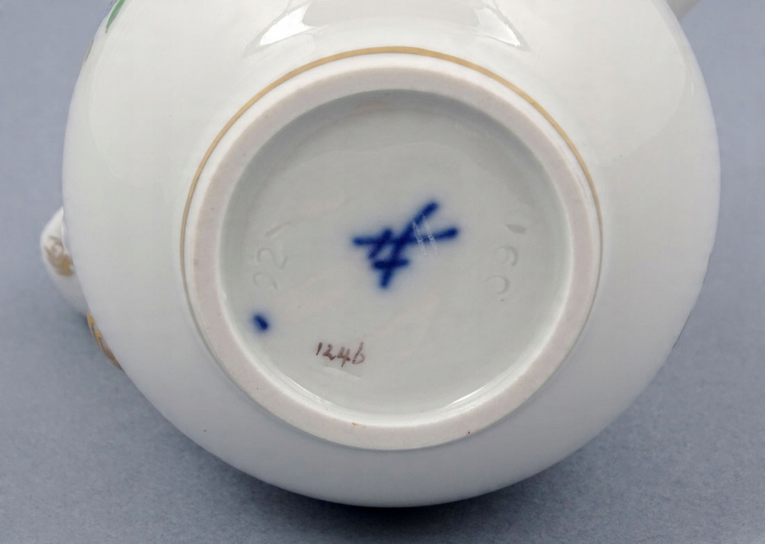 Сервіз підписаний знизу на кожному елементі, під глазур’ю, знаками двох пересічних мечів. , Мейсен, середина 20 століття.