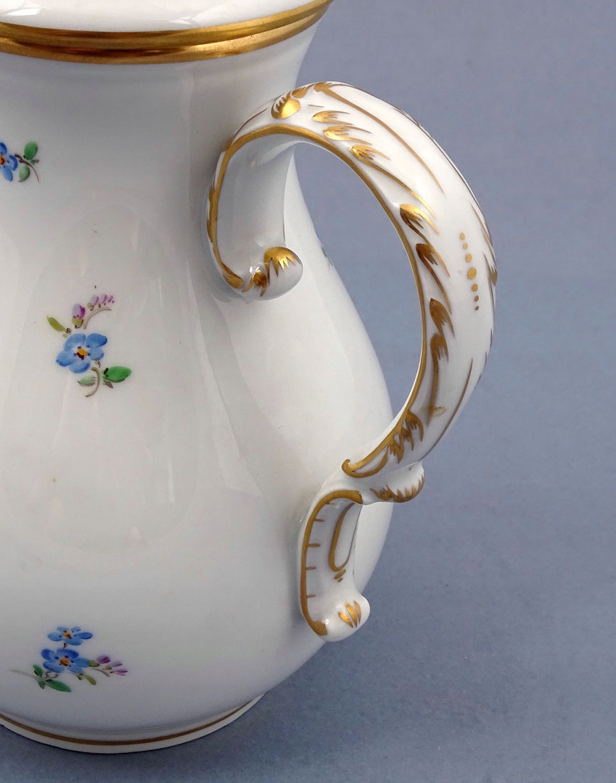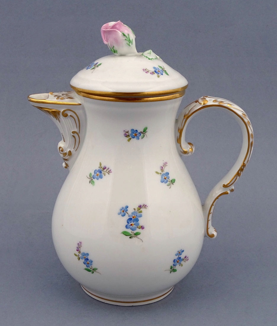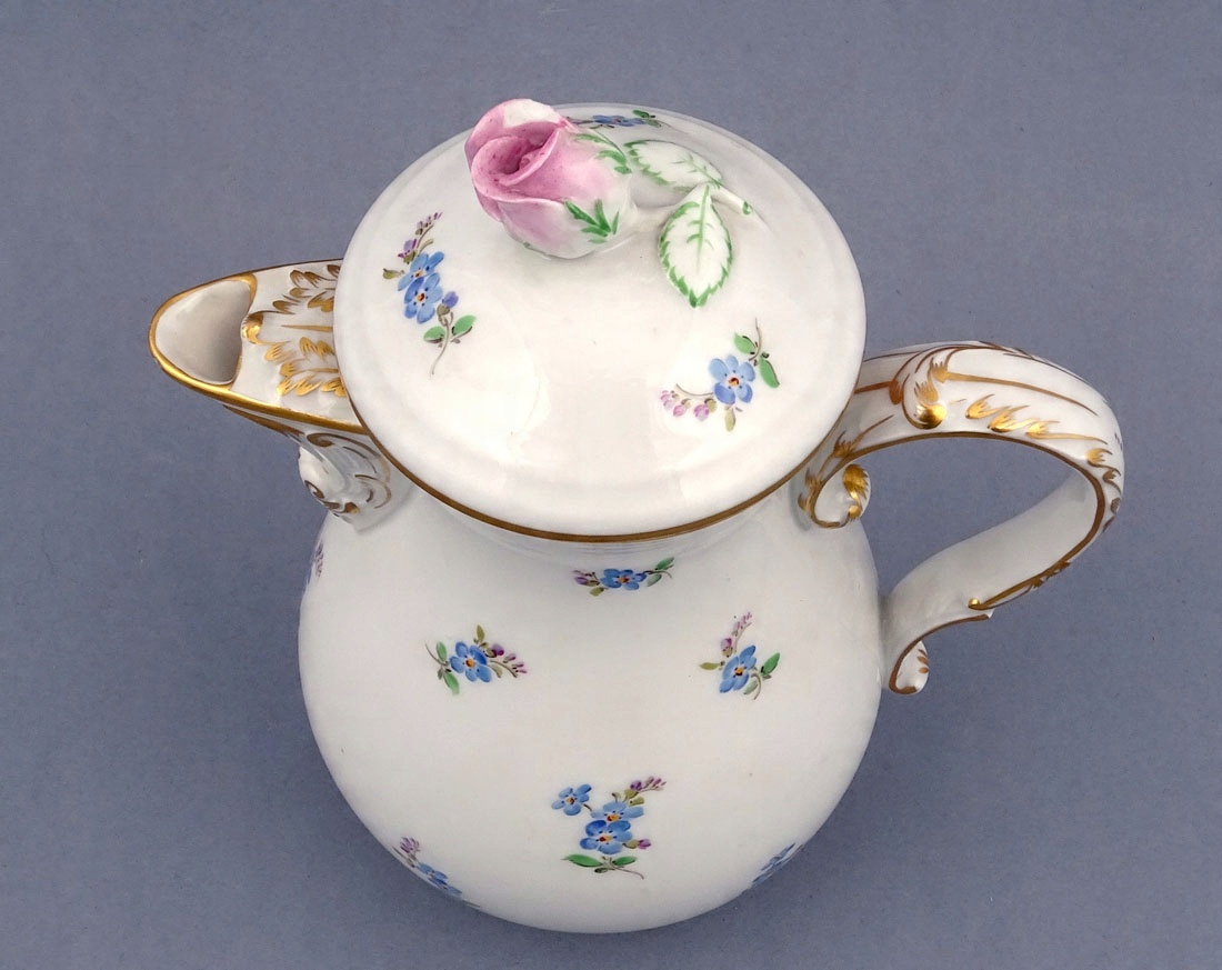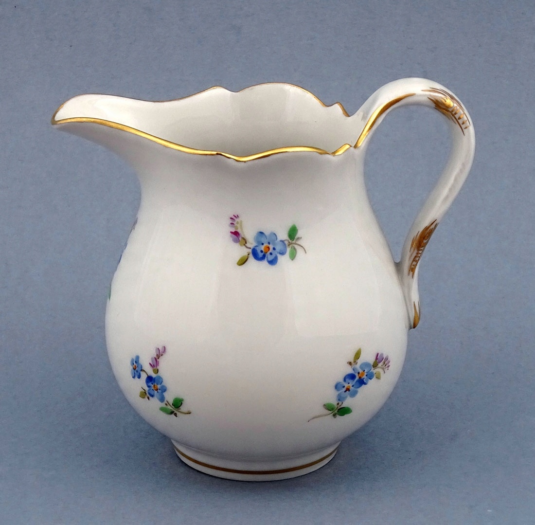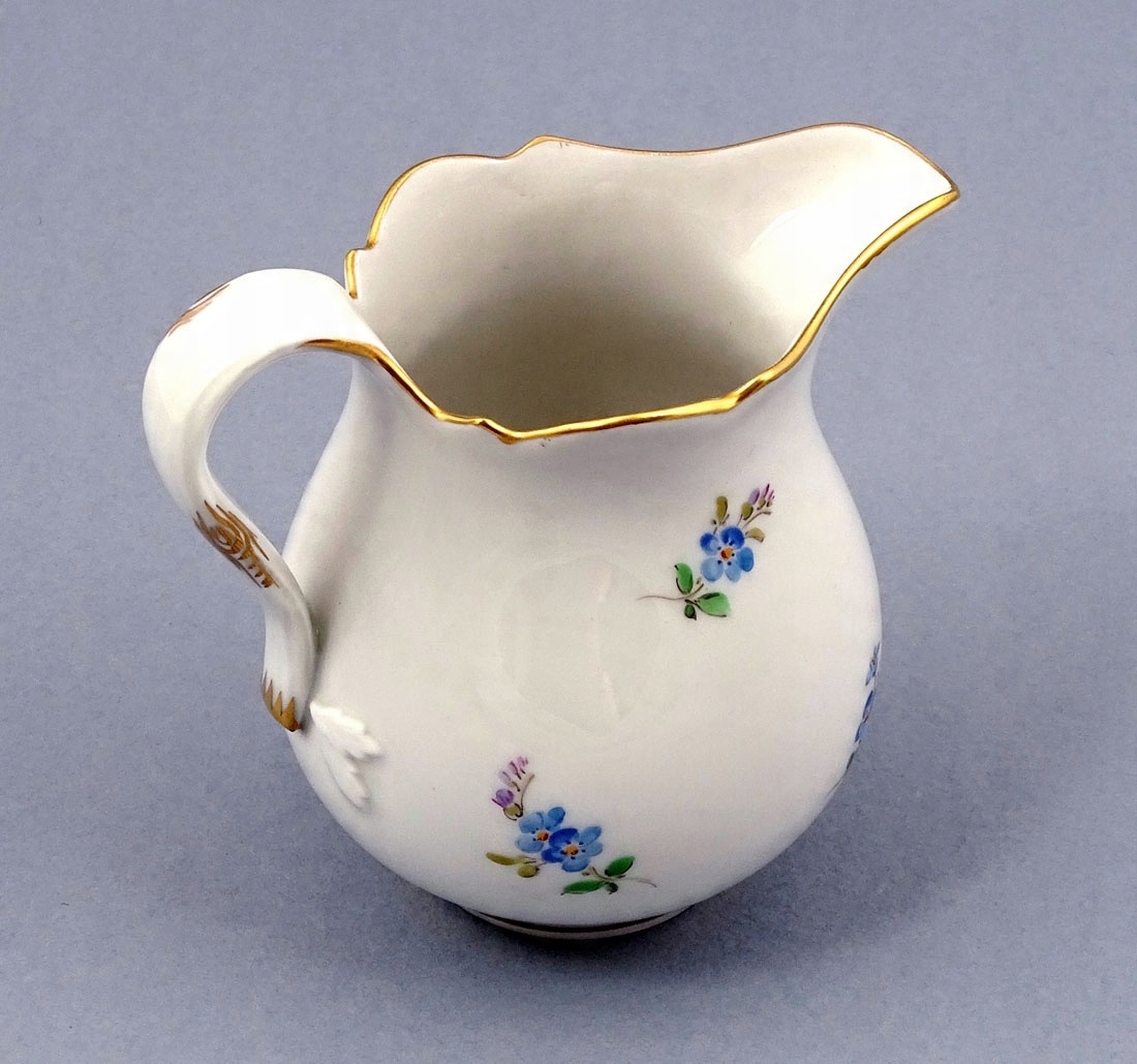 складається з глечика, молочника та шести чашок з блюдцями. Кожен елемент має хвилястий, позолочений край коміра, а також позолочені ручки на чашках, молочниці та глечику. На животиках і в дзеркалі тарілок намальовані ніжні квіти. Глечик із широким носиком, рокайльною ручкою та заокругленою кришкою з трояндою вгорі.