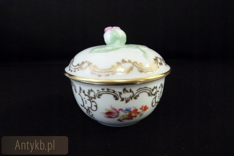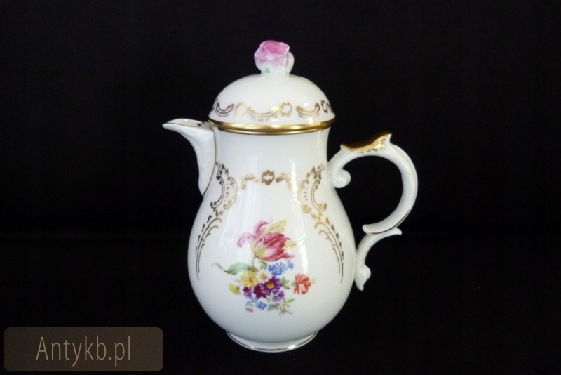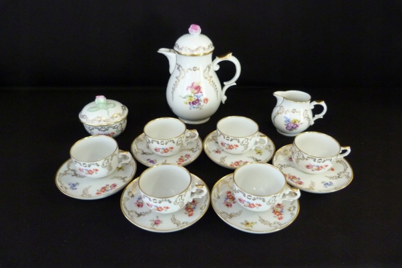Симпатична кавова служба Mokki Furstenberg Manufaktura, з першої половини 20 століття для 6 людей, білим кольором, красиво прикрашеним золотом та квітами. Пітки глечиків та кондитерських виробників мають незвичайну форму квітки троянди. Сеанс підтримується в ідеальному стані, він виглядає красиво, він виглядає красиво, це просто мило. Рекомендую.