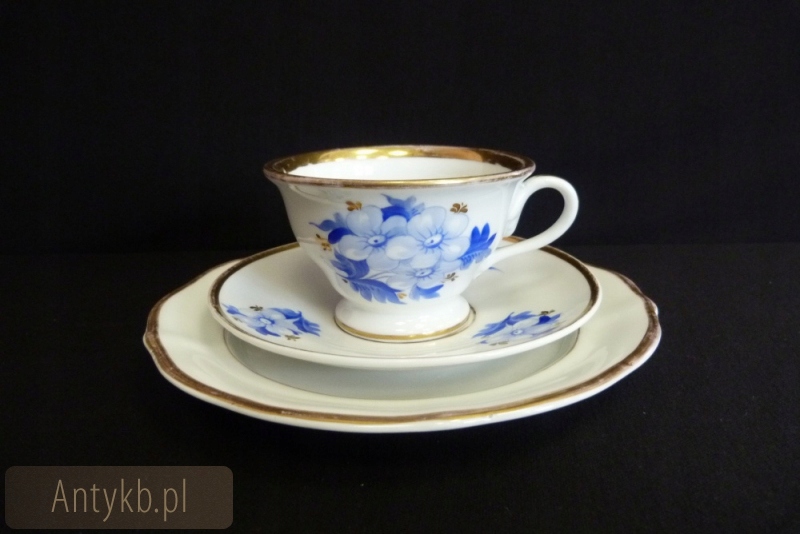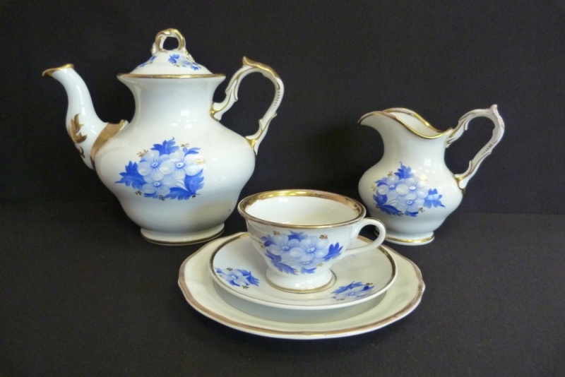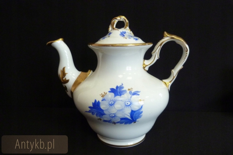 У нас для вас гарний старовинний кавовий сервіз від мануфактури KPM-Krister-Wałbrzych на 8 осіб. красива старовинна форма глечика та молочника, вишукані ручки глечика та молочника та кришка глечика. Гарне поєднання білого фону, блакитних квітів та багатого золота. Сервіз виглядає чудово для свого віку. Сервіз гідний колекціонера і столу в палаці, рідко коли він зберігся в такому хорошому стані, але цей не зберіг цукорницю. Новий покупець буде пишатися таким експонатом, адже він приваблює і радує око кожного знавця порцеляни. Сервіз складається з глечика, висота 20 + 5 см, кришки, молочника, загальна висота 16 см. 8 чашок, висота 6 см. діаметр 9 см. 8 десертних тарілок діаметром 19 см. 8 чашкових тарілок діаметром 15 см. Дуже рекомендую.