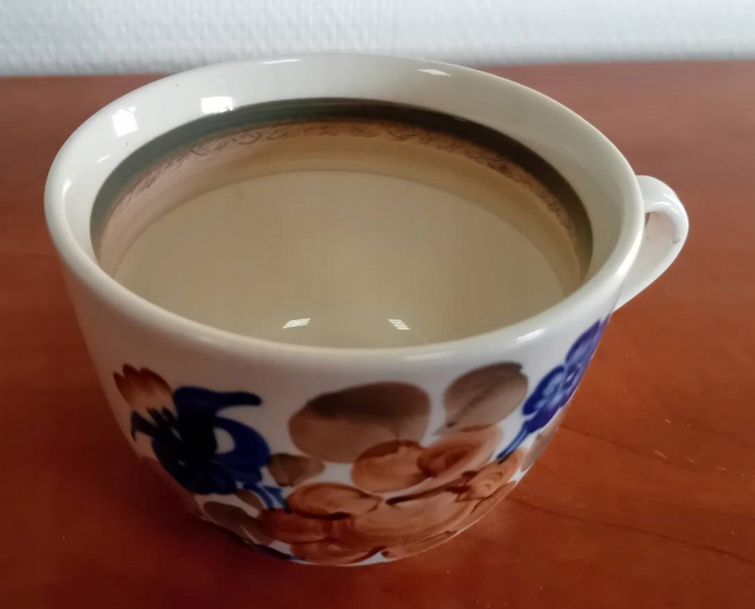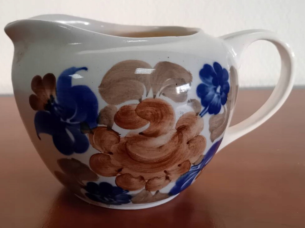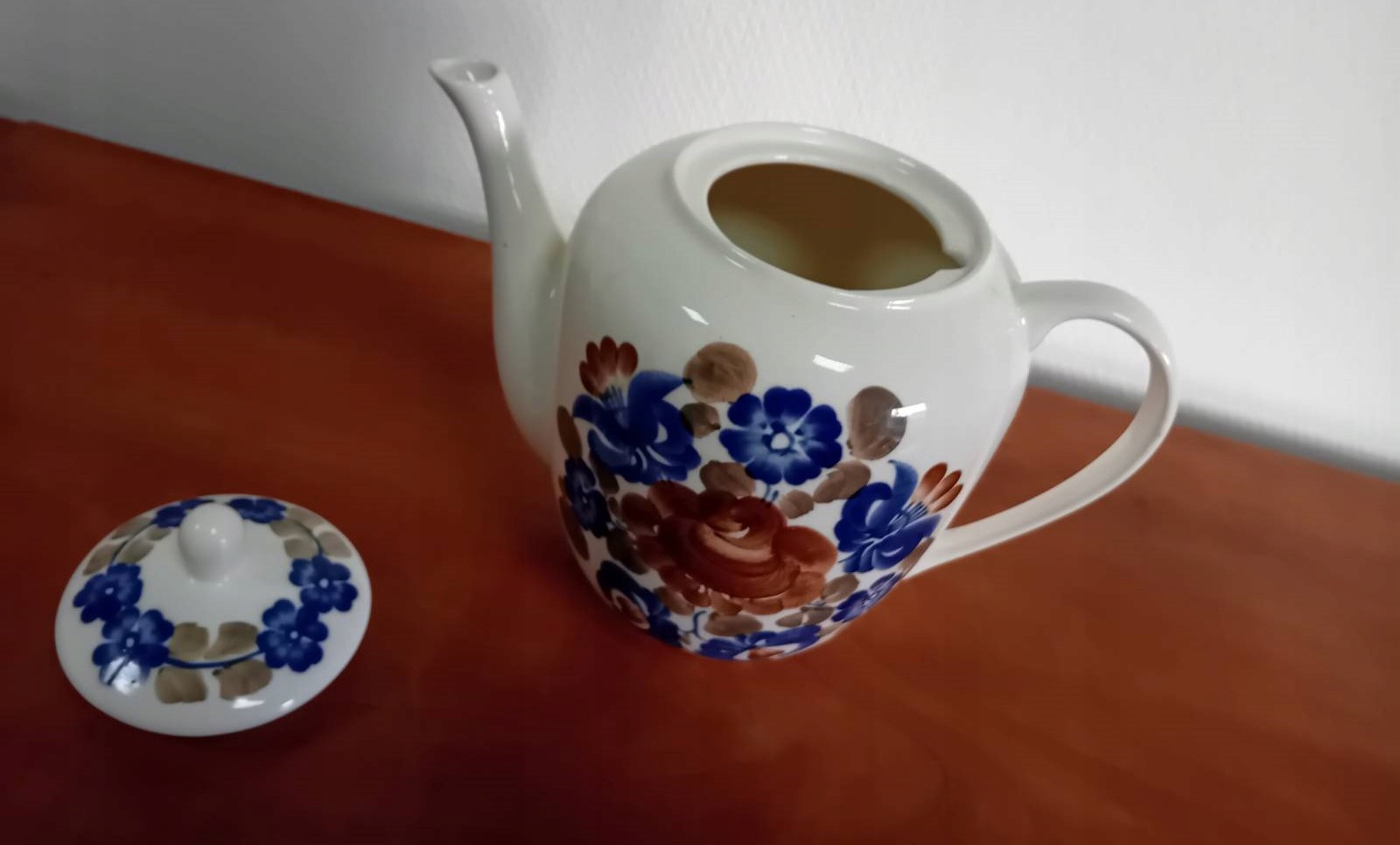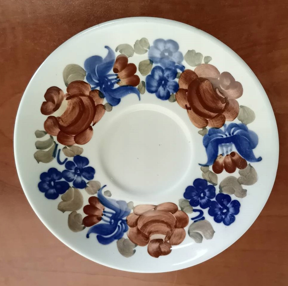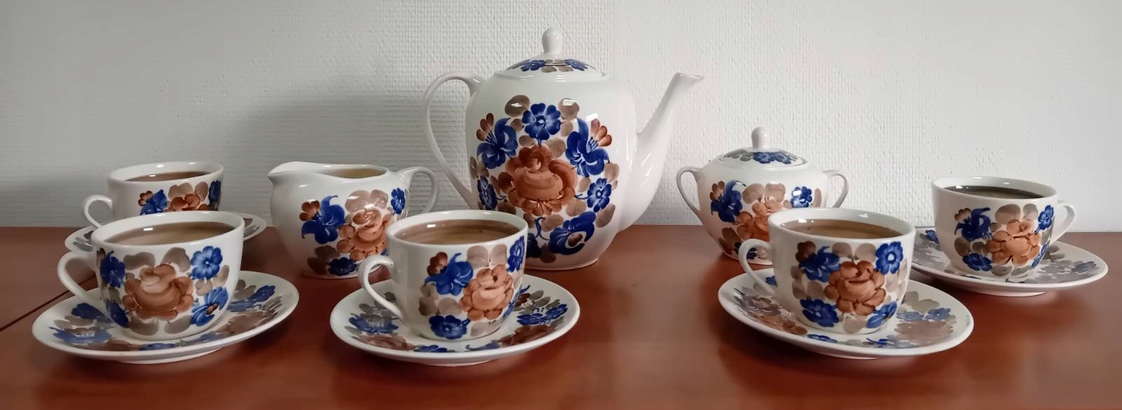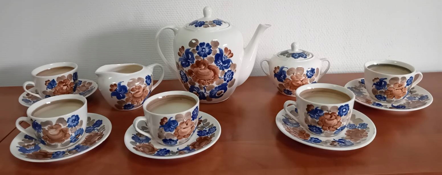 Глазурований фаянсовий кавовий сервіз прикрашений різнокольоровими квітами кобальтового синього, зеленого та коричневого кольорів