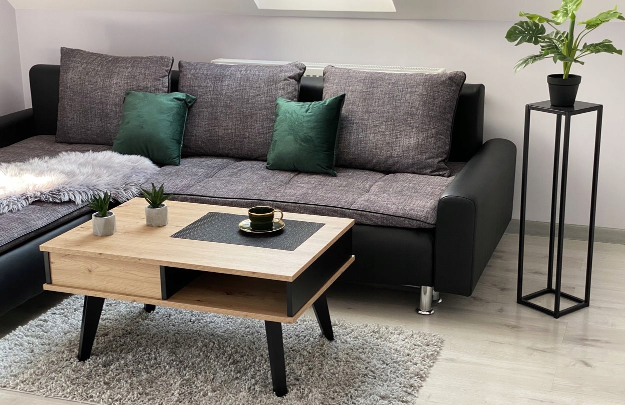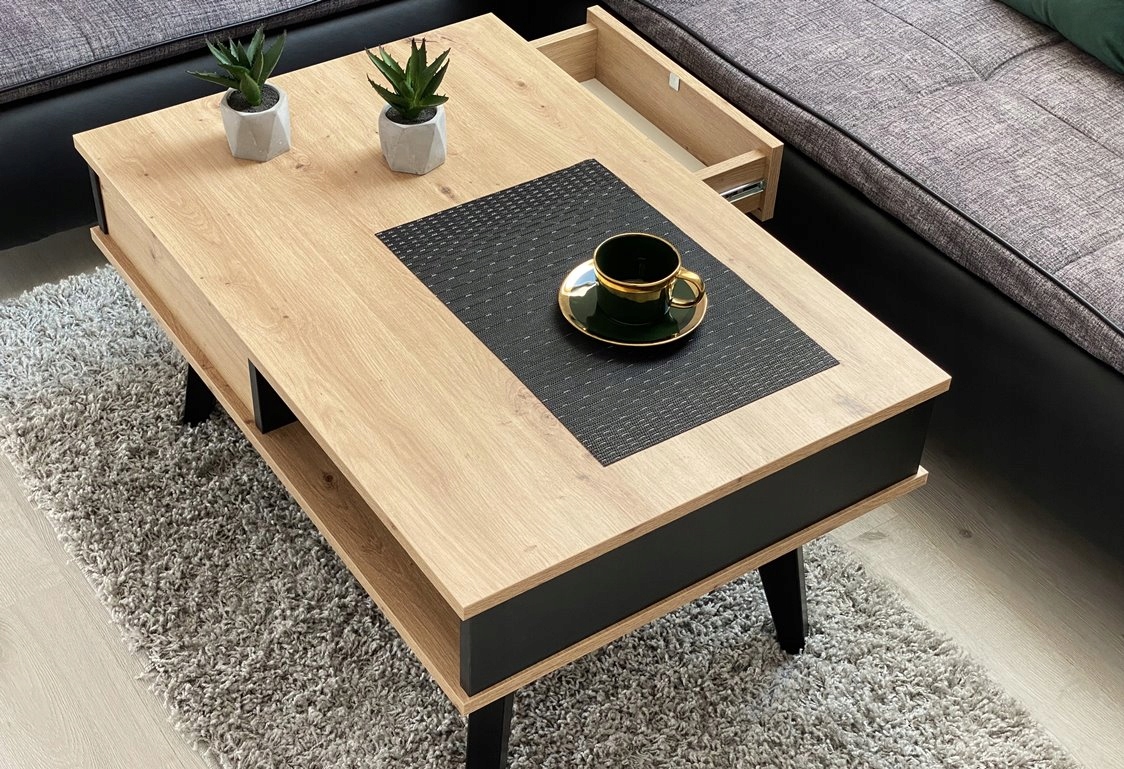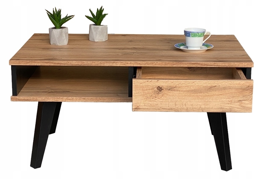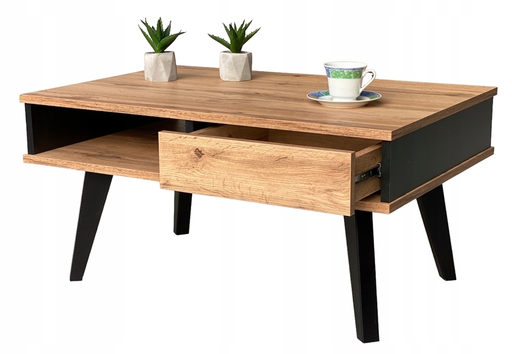 Сучасний журнальний столик RUMBA IIIW з прихованою шухлядою в стилі лофт і дерев'яними ніжками безсумнівно стане прикрасою будь-якої квартири.