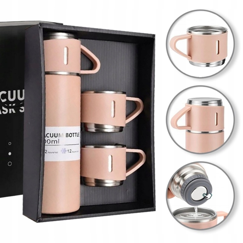 - Набір включає термос і 3 чашки, упаковані в коробку з ідеальним подарунком.