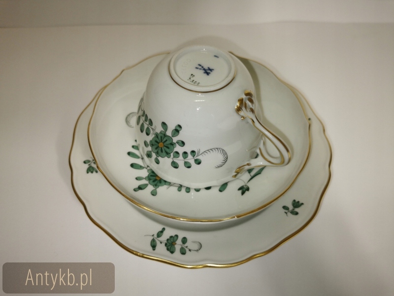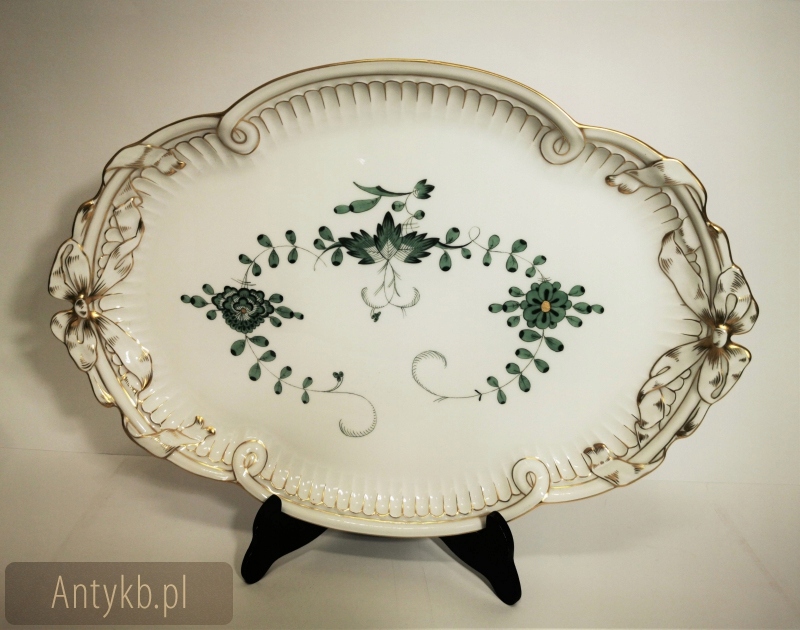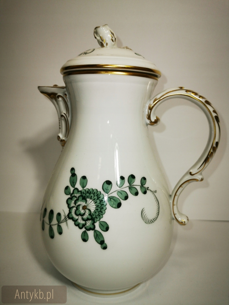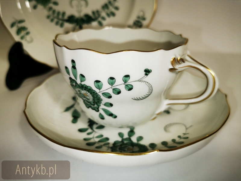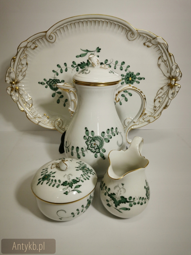 Ми представляємо феноменальну каву/чайну службу, створену з найвищої якості, порцеляни Miśnieńska. Що змушує його виділитися, -це зелені квіти, зафіксовані в індійському малюнку із зеленим листям та вишуканими золотими оздобленнями. Кожен з елементів зроблений з неймовірною точністю та вишуканістю. Фільми мають нерегулярні краї, покриті золотом- як соуси з трохи більшим станом. Крім того, послуга складається з цукрової миски, молока, набору десертів 6 -лівих і лотка. Найбільше враження справляється з костюмом з прекрасним підносом, прикрашеним полегшенням чаші з лука, розміщеним з обох боків судна. У глечику та кондитерськості на обкладинці є тривимірні прикраси троянди. Набір датується 20 століттям, ймовірно, створеним близько 1940 року, і його справжність підтверджується еталонним числом 2 схрещених шаблів кобальту, видно на дні корекцій судна- 2 повідомляє нам, що порцеляна належить до другого виду порцеляни. Веб -сайт виглядає вражаючим.