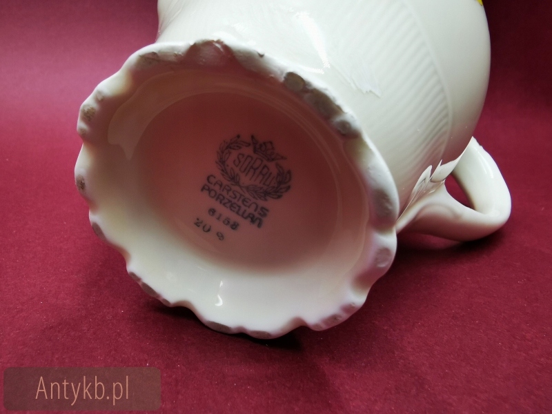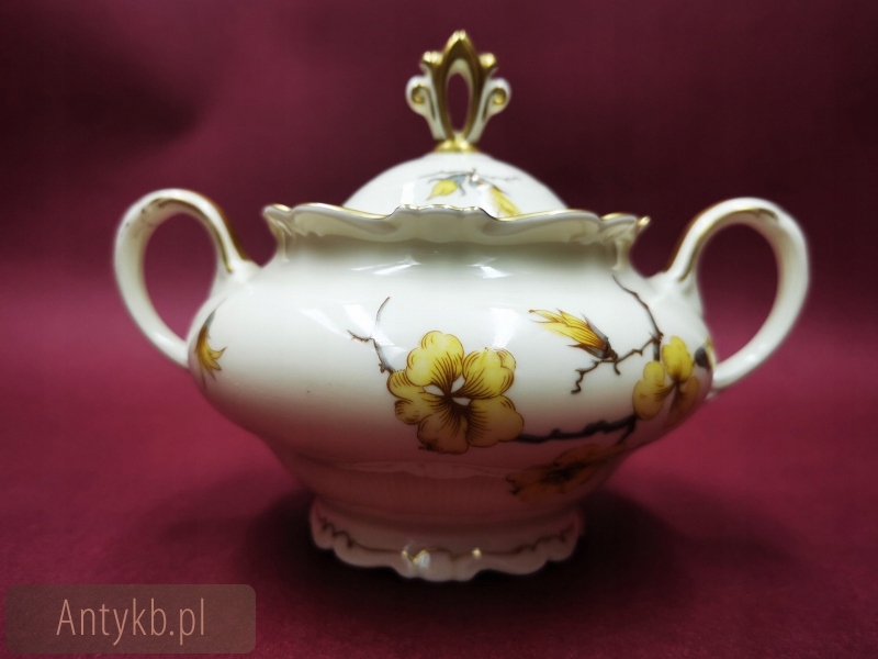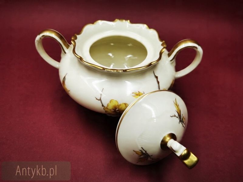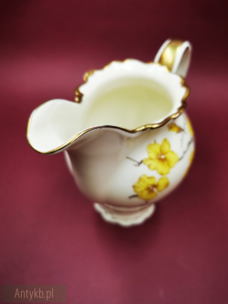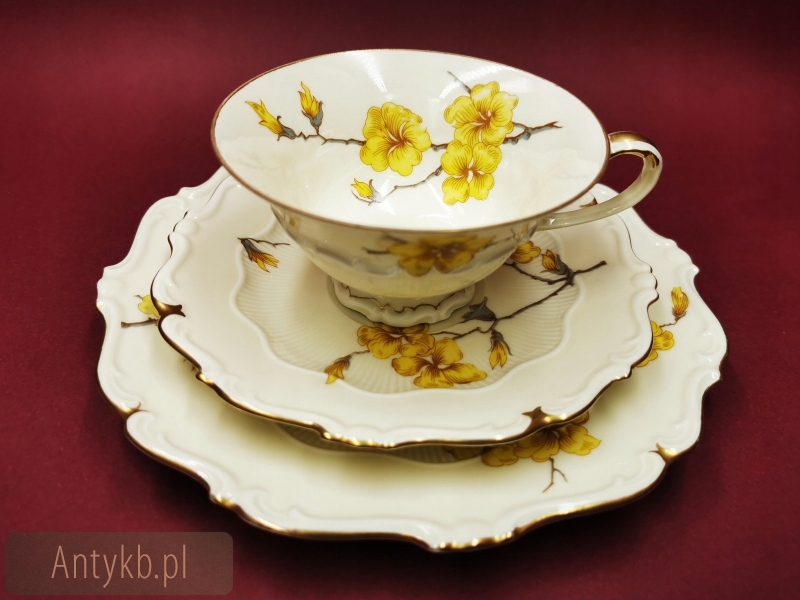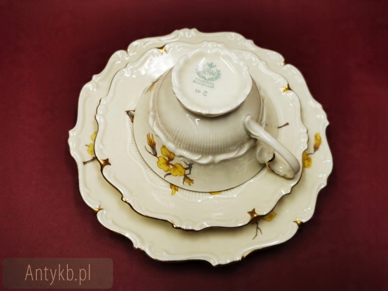 Представляємо чудовий набір для чаю та кави від Carstens Porzellanfabrik SORAU (сьогодні Żary), на 6 осіб. Сервіз складається з 6 чашок із блюдцями, 6 десертних тарілок, глечика, молочника та цукорниці. Набір виготовлений з високоякісної порцеляни і має колір світло-екрю. Крім того, її прикрашає красивий рельєфний декор в стилі рокайль і хвилясті лінії, оспіваний візерунком зі звучною назвою - кавалер, створений в 1935 році. Весь сервіз прикрашений красивими квітами форзиції, що надає всьому енергійного весняного виразу.