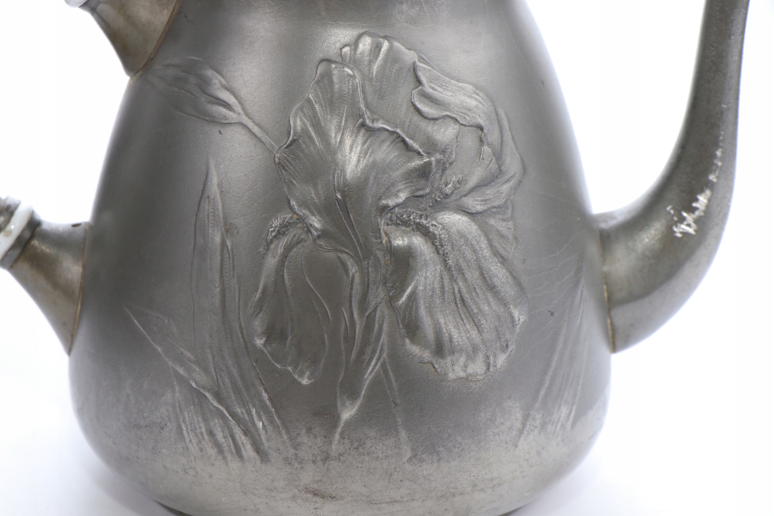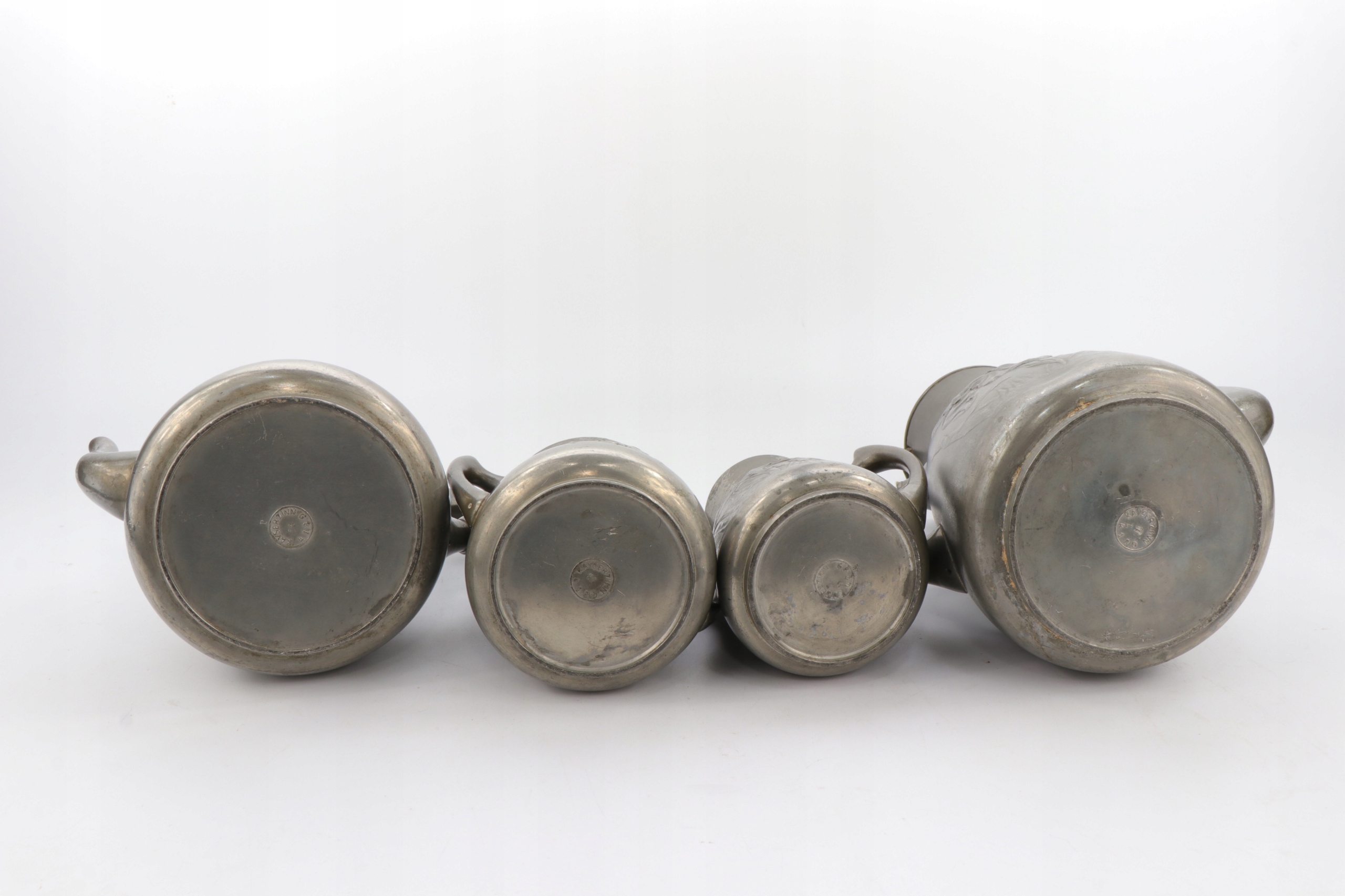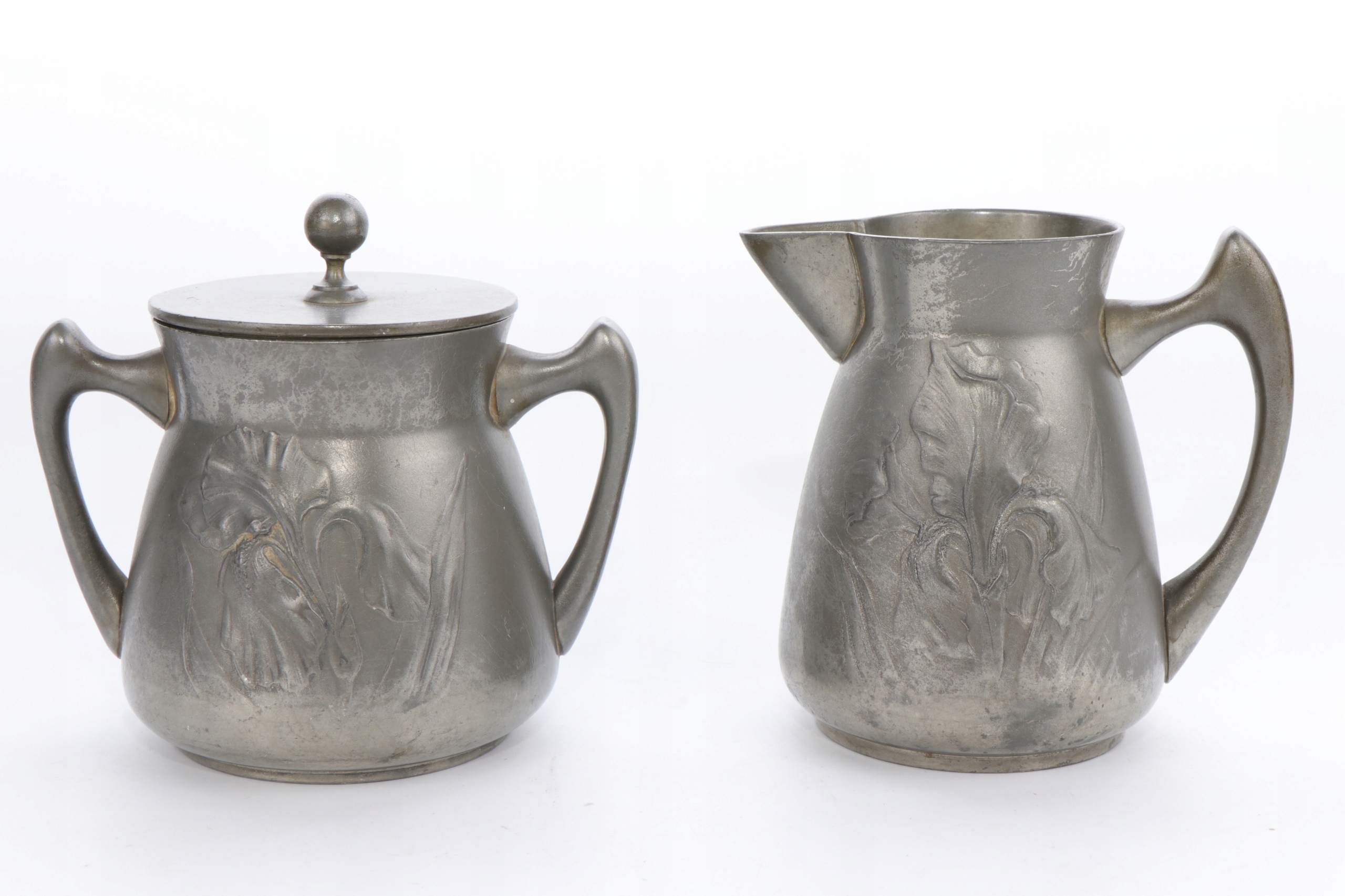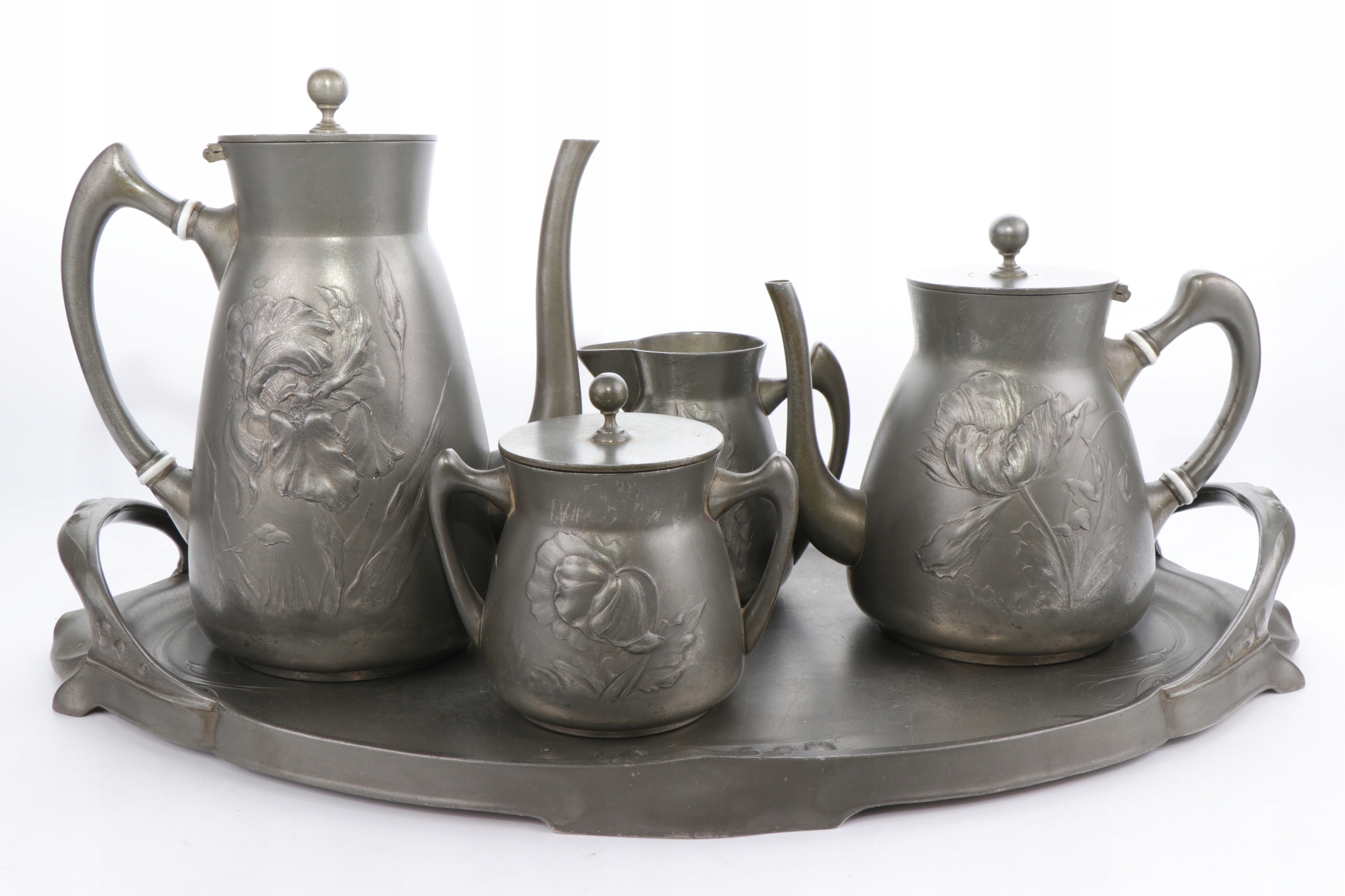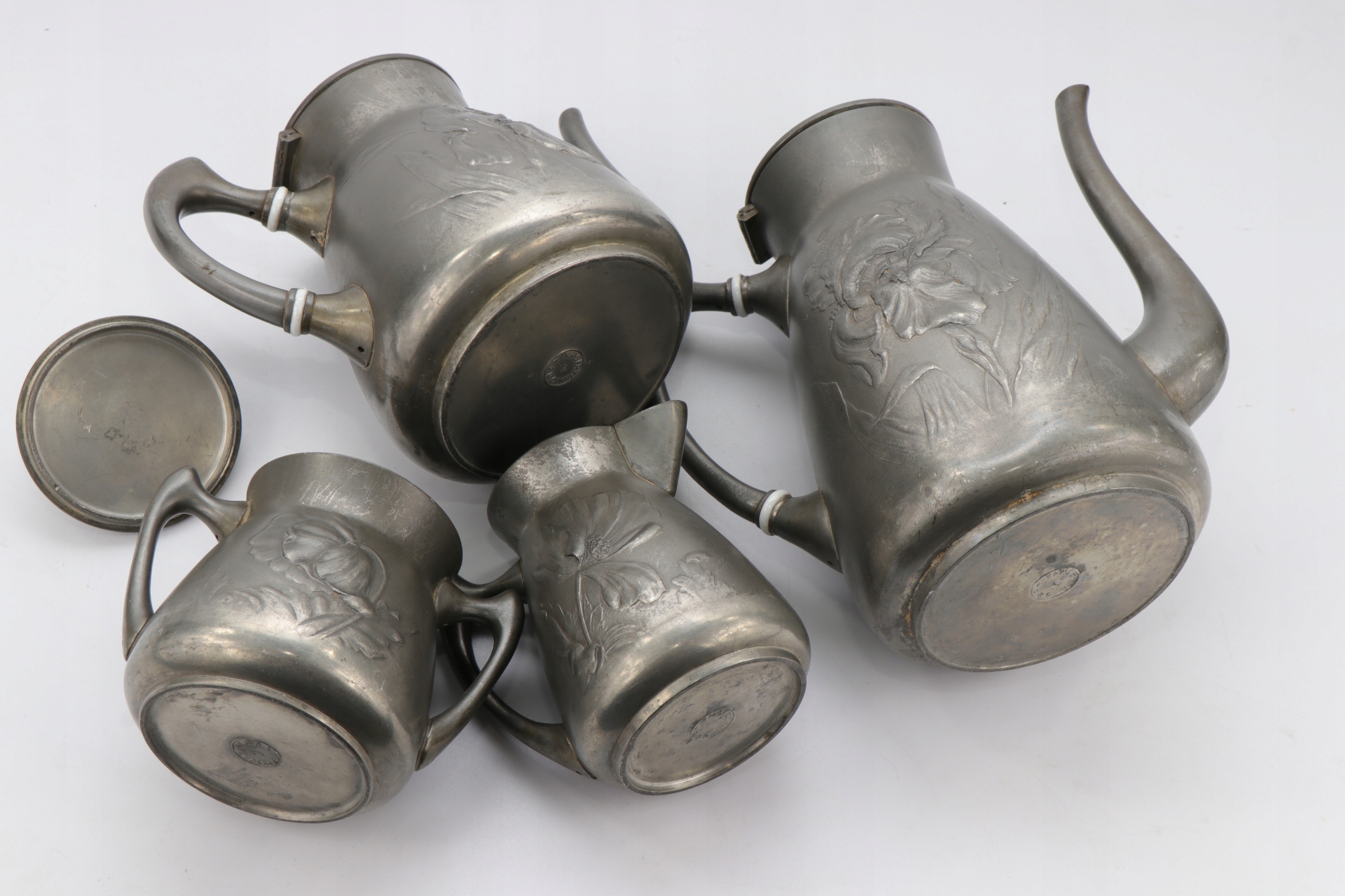 Набір у стилі модерн із двох глечиків, цукорниці та молочника з олова, розроблений Гуго Левеном. Об'єкт, прикрашений рельєфним орнаментом з маків та ірисів. Предмети позначені каталожним номером 4189.