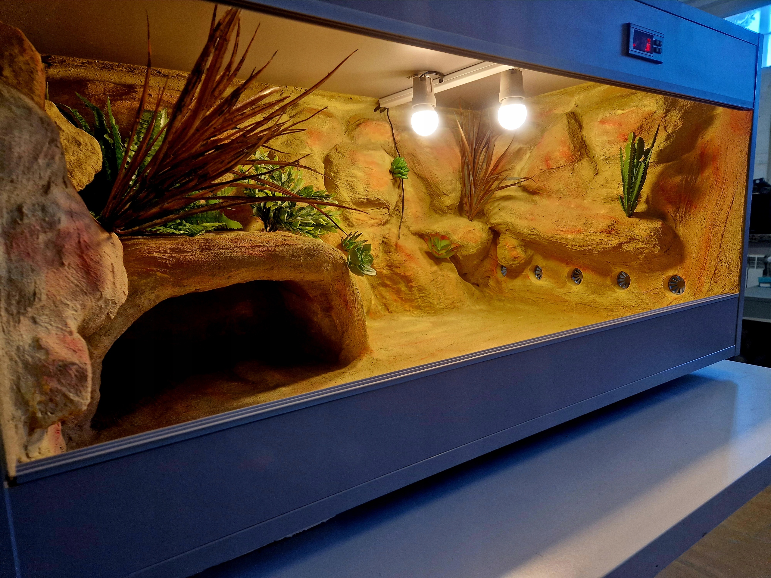 Вимір бака повинен бути обраний належним чином будинком розміру та віку тварини. Терарія, замовлена вами, не буде копією, як представлені нижче - але вони можуть бути подібними. Ми будуємо кожен танк з нуля. Покупець має можливість вибору скельної системи (наскільки це можливо) та фонового кольору тераріуму.